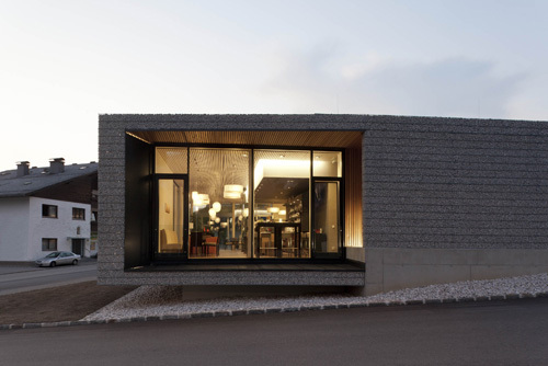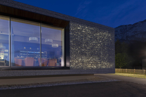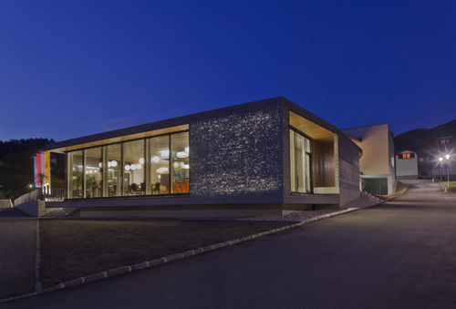 Der vom Hauptgebäude abgesetzte Mehrzwecksaal besitzt Fassaden aus steinbefüllten Gabionen, eine deutliche Anspielung auf den Ortsnamen.