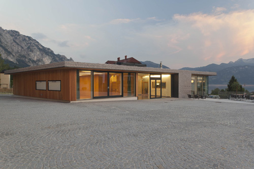 Zwei Bauteile – ein langgestreckter Baukörper sowie ein freistehender, eingeschossiger Baukörper bilden den Rahmen für den neu geschaffenen Dorfplatz in Steinbach am Attersee.