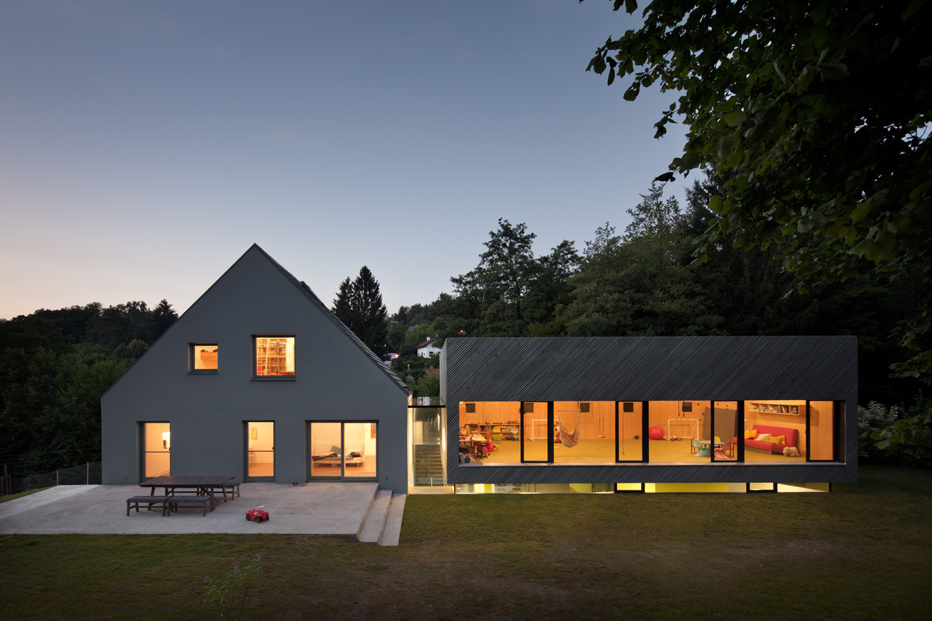 In der Planung wurden mögliche Nutzungsänderungen für viele Jahre mitgedacht. Die schwebende Holzbox wird von der ganzen Familie als Spiel- und Arbeitszimmer verwendet. Für die Unterteilung in vier Kinderzimmer und den Einbau von Sanitärräumen sind bereits sämtliche Installationen vorbereitet. Im rundum verglasten Erdgeschoss des Zubaus befindet sich eine Einliegerwohnung für die Großmutter. Eine spätere Nutzung als Ordination ist ebenso möglich wie eine Trennung des Zubaus als eigenständige Wohneinheit für eines oder mehrere Kinder.