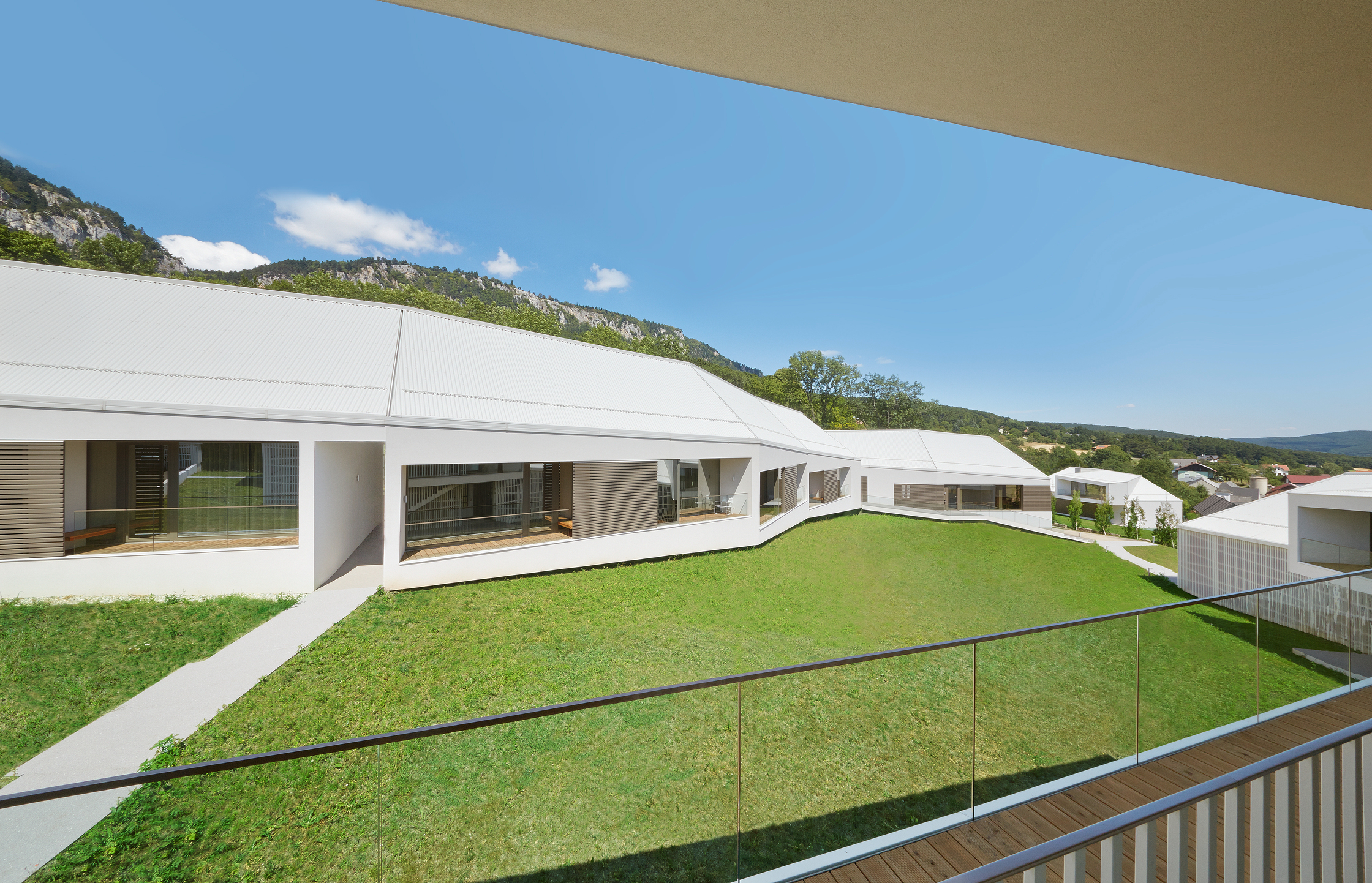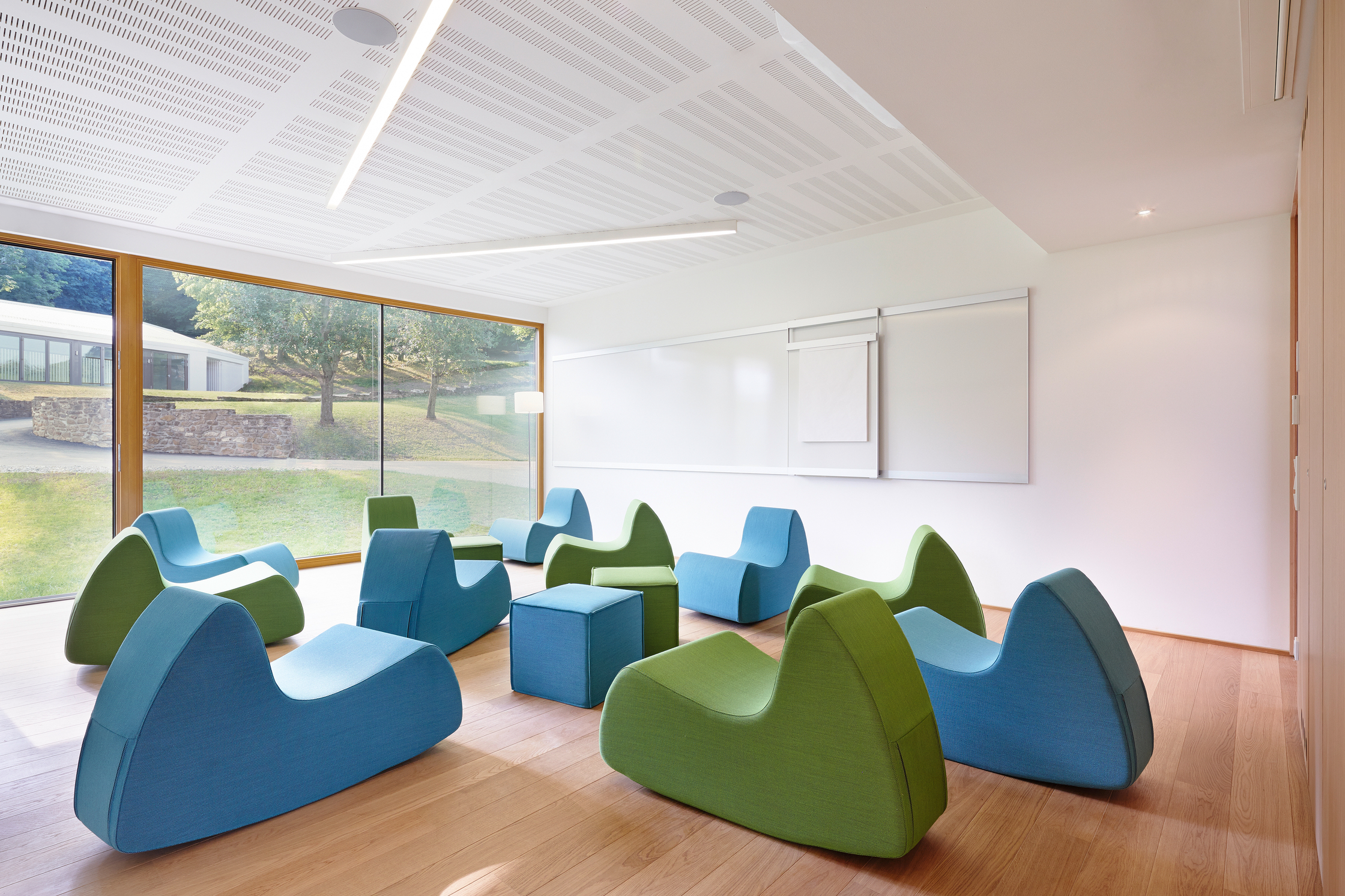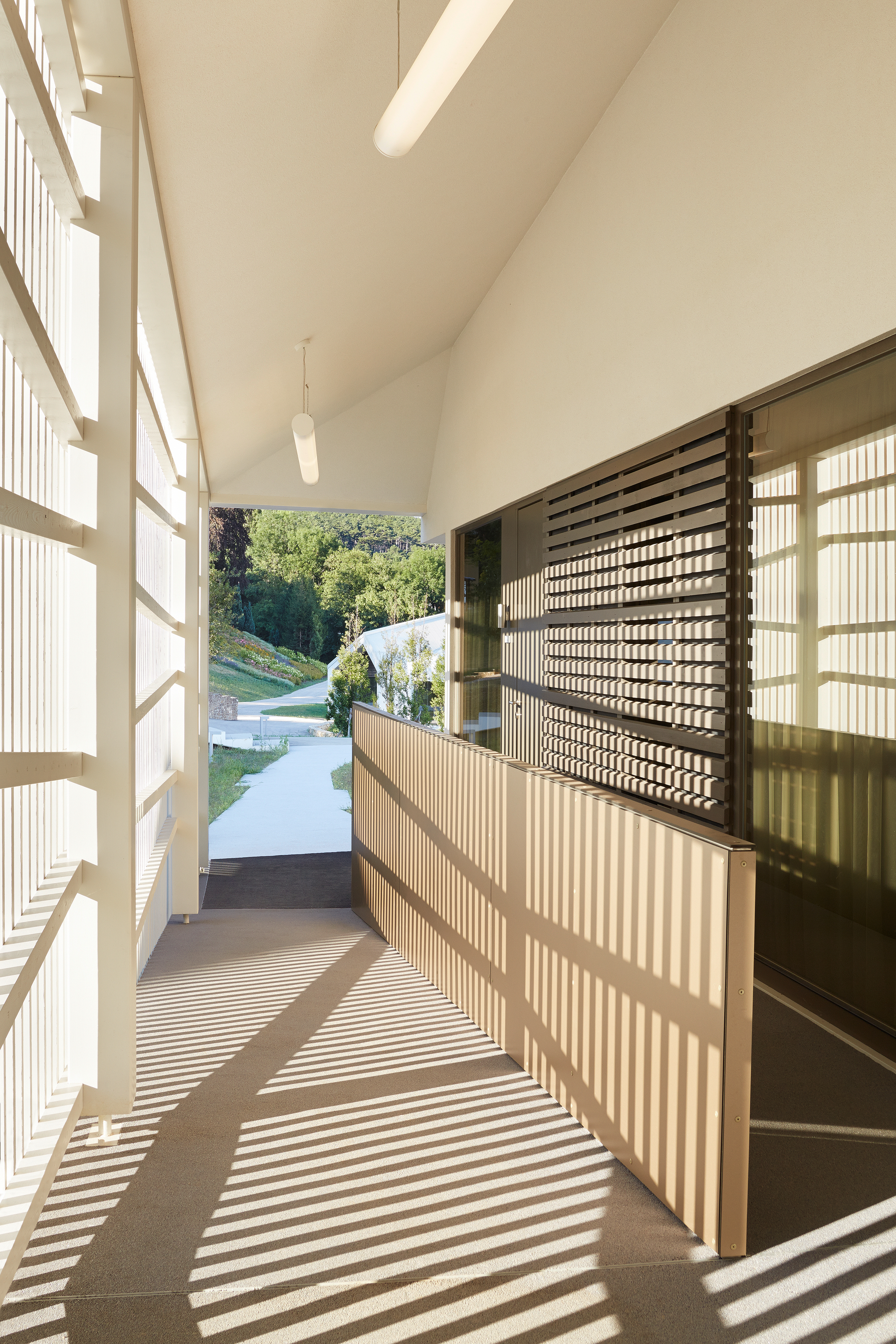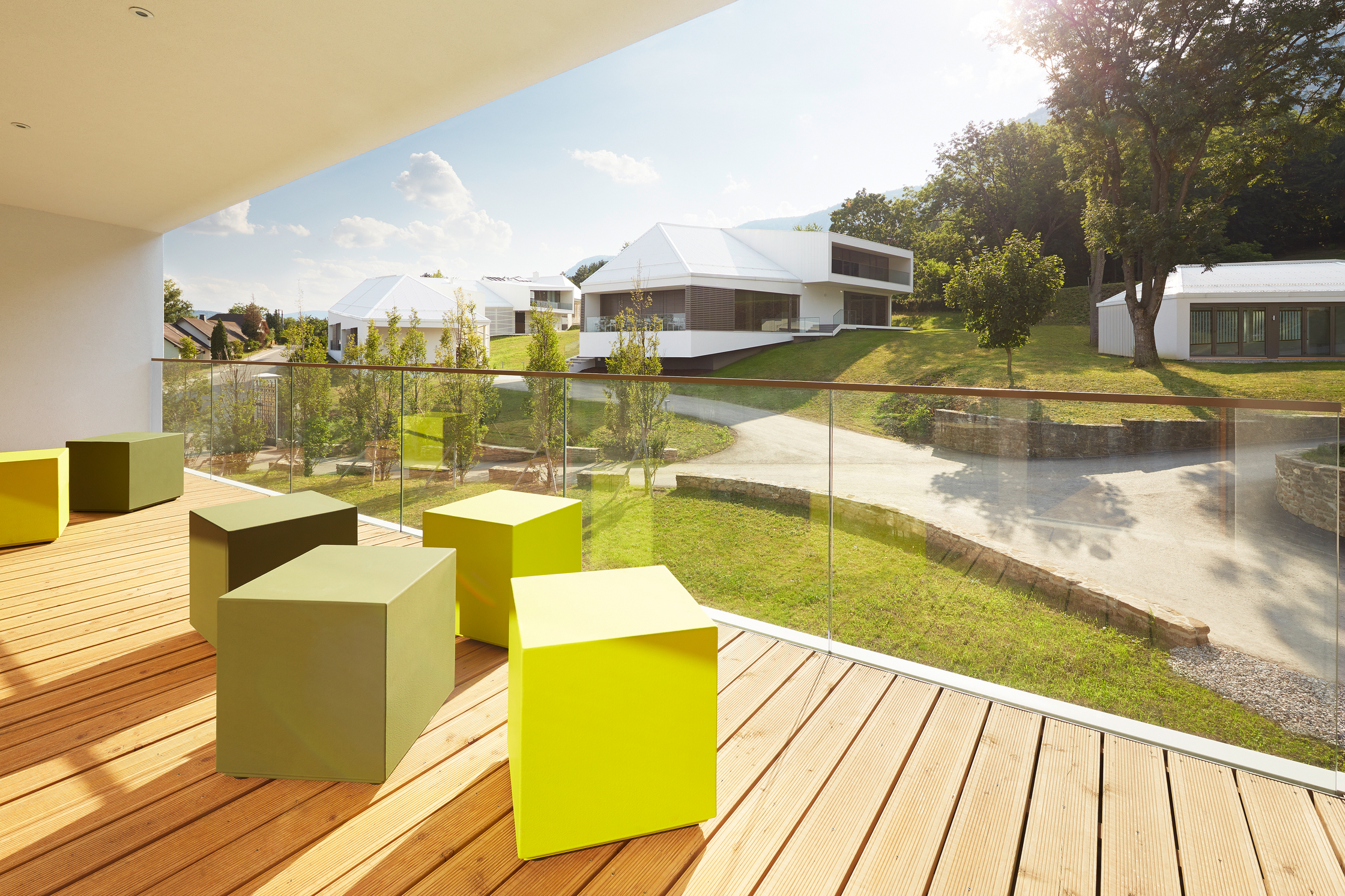 Die Konferenzanlage weist einen Gesamt-Heizwärmebedarf von HWB=12,65kWh/m³a auf, aufgegliedert auf die Gebäude ergeben sich ein Heizwärmebedarf für Gebäude I HWB=13,67kWh/m³a, Gebäude II HWB=14,53kWh/m³a und Gebäude III HWB=9,92kWh/m³a. Fenster und Türen sind in Holz und Holz-Aluminium mit einer 2-Scheiben-Wärmeschutzverglasung ausgeführt. Zur Gewährung eines durchgängigen Bauteilprinzips ist der gesamte Dachraum als Warmdach realisiert. Zur Vermeidung sommerlicher Überwärmung erfolgt die Verschattung der Fenster des Beherbergungsgebäudes durch Vordächer und auskragende Decken. Fenster und Fenstertüren des Konferenzgebäudes sind mit innen- und außenliegenden Verschattungssystemen ausgeführt. Zur Verbesserung des Raumklimas sind sämtliche Boden- und Geschossdecken in Nassestrich hergestellt.
