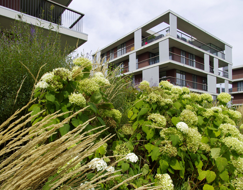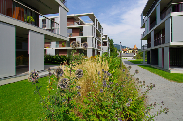 Insgesamt neun viergeschoßige Häuser sind so über das Grundstück verteilt, dass sie einander nicht die Sicht verstellen und überdies zwei gemeinschaftlich genutzte Freiräume fassen. Diese sind in eine von Anna Detzlhofer gestaltete Grünanlage eingebettet, die als Fortsetzung der historischen Parkanlage im Osten gedacht ist. Die Entscheidung, die ebenerdigen Wohnungen nicht, wie sonst häufig geübt, durch die Zuteilung von Eigengärten zu privilegieren, bewahrt der Anlage ihre Großzügigkeit. Die einzelnen Häuser erheben sich aus Rasenflächen, die durch ein rechtwinkelig gehaltenes Wegesystem geteilt werden. Staudenbeete in geschwungener Linienführung und mit Bedacht auf die ungestörte Aussicht gesetzte Bäume greifen weitere Motive des historischen Parks auf und verankern so die für das Projekt gewählte Bezeichnung „Parkvillen“ in der Wirklichkeit. So ein Park muss von Autos naturgemäß vollkommen frei gehalten werden. Dem kommt die Topografie entgegen: Dank der Hochlage des Bauplatzes über der Straße war es möglich, eine Tiefgarage in das Gelände zu versenken, die an alle neun Häuser angebunden ist, sodass selbst für das Beziehen der Wohnungen oder schweres Gepäck oberirdisch eine rein fußläufige Erschließung der Anlage genügt.