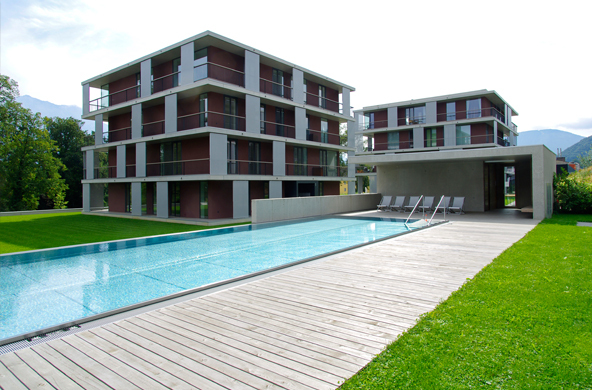 Die Anlage ist auch bautechnisch auf dem neuesten Stand errichtet: Hohe Wärmedämmwerte der Hülle, die sorgfältige thermische Entkopplung der auskragenden Bauteile und eine kontrollierte Wohnraumlüftung mit Wärmerückgewinnung gewährleisten geringe Heizkosten. Die Erschließung derHäuser erfolgt über zentral angeordnete, von oben belichtete Stiegenhäuser, die eine einläufige Treppe und einen Lift fassen. Die solide Ausführung der Gebäude korrespondiertmit klug organisierten Grundrissen und einer Material- und Farbwahl, die den Anspruch der Gediegenheit erneut unterstreicht. Doch während in den Wohnhäusern die Interpretation des Raumes den Boden des zwar Feinen, aber dennoch Alltäglichen aus gutem Grund nicht verlässt, zeigen Riepl Riepl im zentral gelegenen Badehaus, was sich aus Sichtbeton und Tannenholz alles machen lässt, wenn man mit Raum, Licht und Material umzugehen weiß. In diesem kleinen – Umkleiden, Sanitärzellen und einen gedeckten Sitzplatz fassenden – Gebäude und dem anschließenden, mit einigem Geschick in die Topografie des Parks gefügten Schwimmbecken wird die Inspiration spürbar, die Architekten aus einer Aufgabe, einemOrt, einer Stimmung zu schöpfen vermögen.