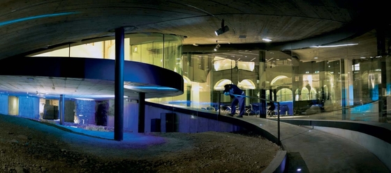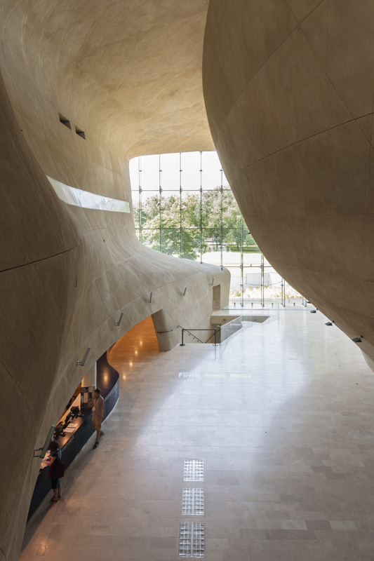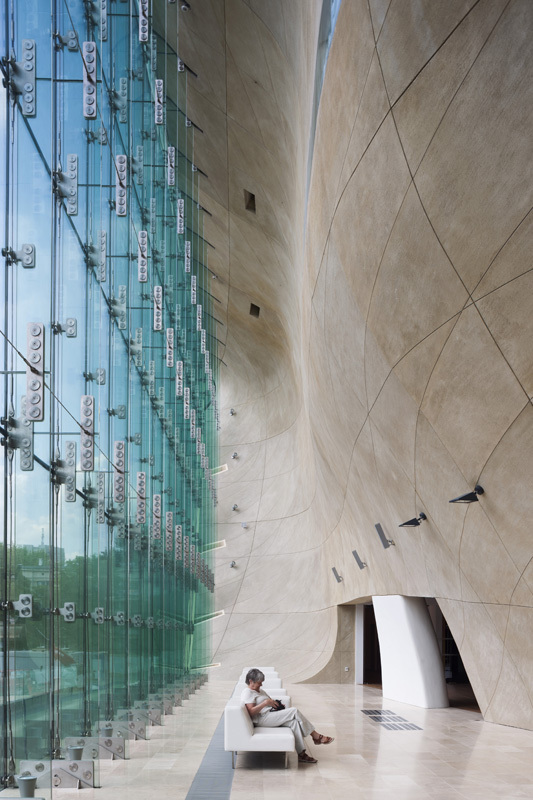 Drinnen erst, in diesem Canyon, der von den wenigsten nur als amorphe Gesteinsformation verstanden werden will, weil das 2. Buch Mose schwerer wiegt als jeder architektonische Grundgedanke, werden die Worte der beiden Hausverantwortlichen manifest. Dramatische Blicke, dramatische Räume tun sich hier auf. Es ist dies die angeblich größte zweiachsig gekrümmte, monolithisch zusammenhängende Wandoberfläche, die je gebaut wurde: 63 Meter lang, fast 25 Meter hoch, wenn man die bauchige Fundamentbasis im Untergeschoß, wo sich die 4000 Quadratmeter große Hauptausstellung befindet, miteinbezieht.
