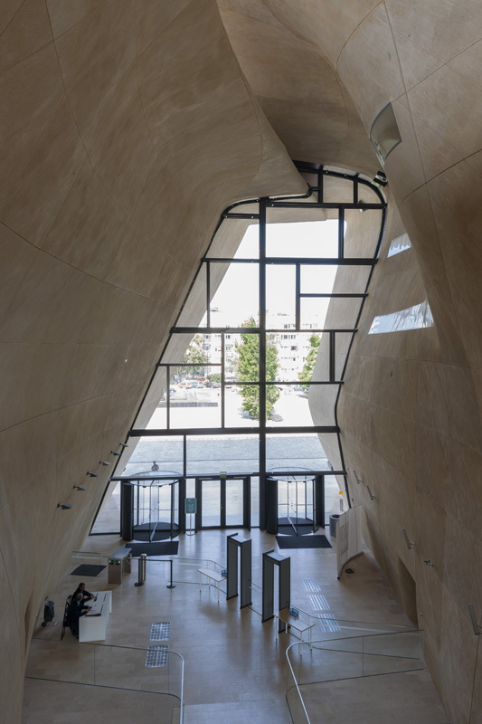 „Wir sind von einem Canyon ausgegangen, der das Gebäude in der Mitte teilt“, sagt Maritta Kukkonen, Projektleiterin im finnischen Architekturbüro Lahledma & Mahlamäki. „Aber sobald Religion und jüdische Geschichte im Spiel sind, sehen die meisten in diesem räumlichen Zitat, das uns so fasziniert hat, sofort Moses und den Marsch durch das Rote Meer. Das war zwar kein vordergründiger Gedanke, und ich bin der Meinung, dass Symbolik in der Architektur ein prinzipiell schwieriges Kapitel ist, aber wenn man diese Geste so interpretieren will, dann ist uns das nur recht. Geografisch liegen die beiden Motive ja nicht weit auseinander.“