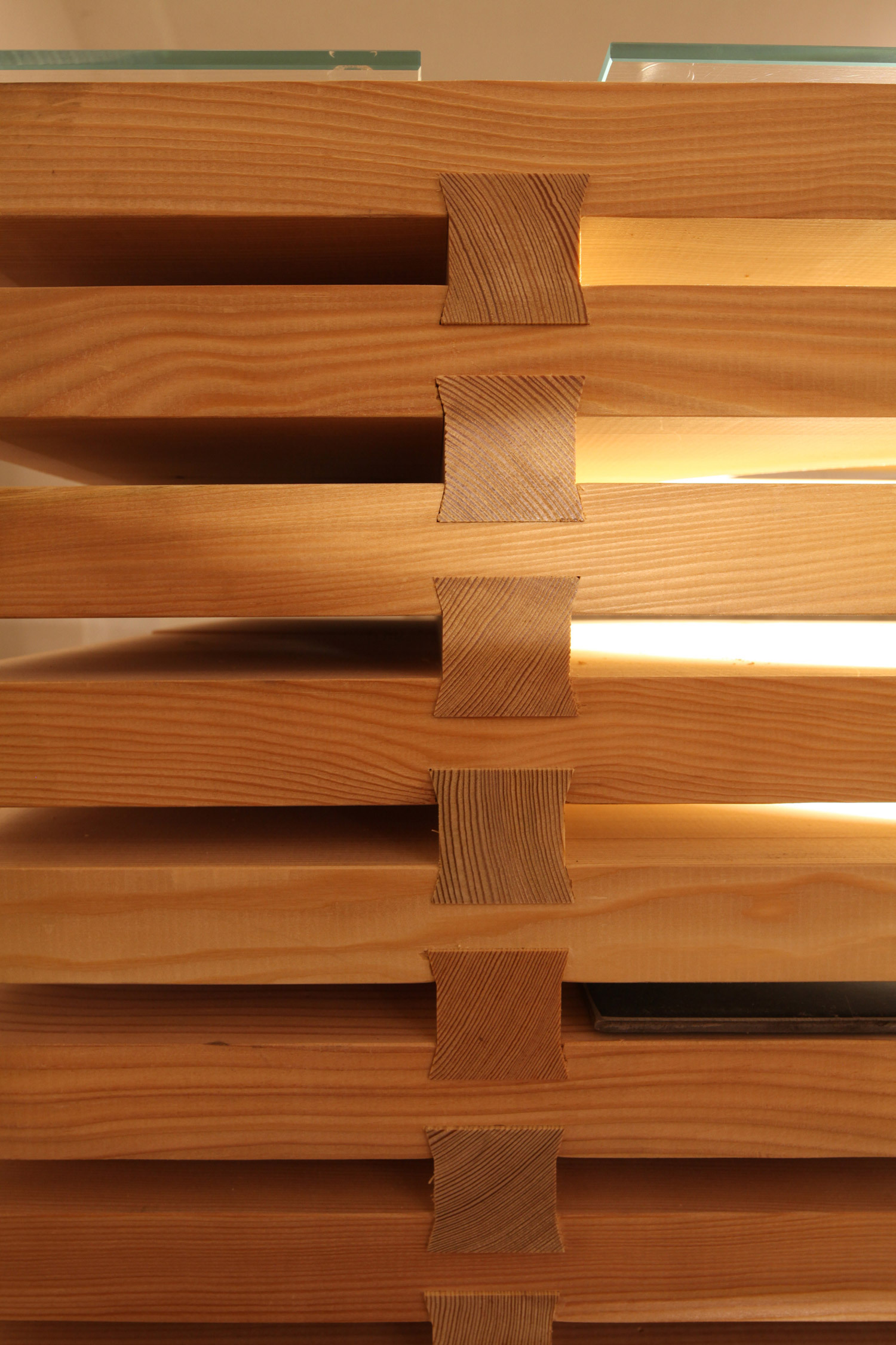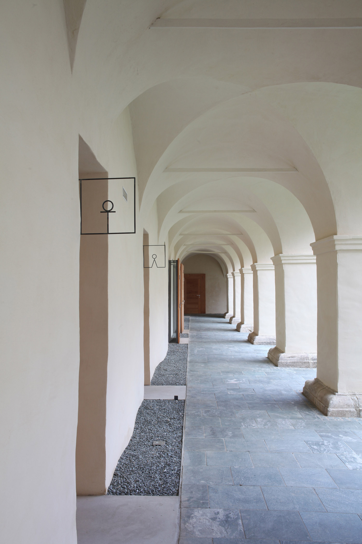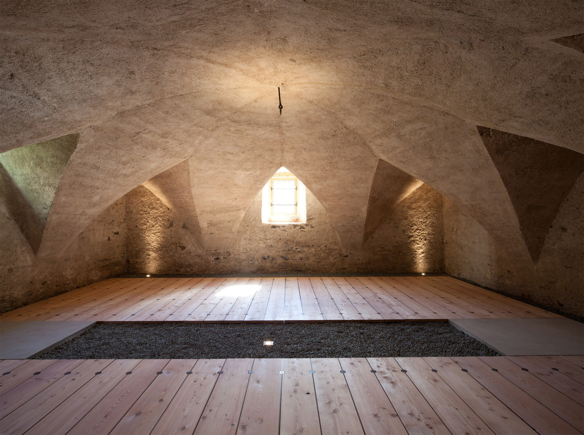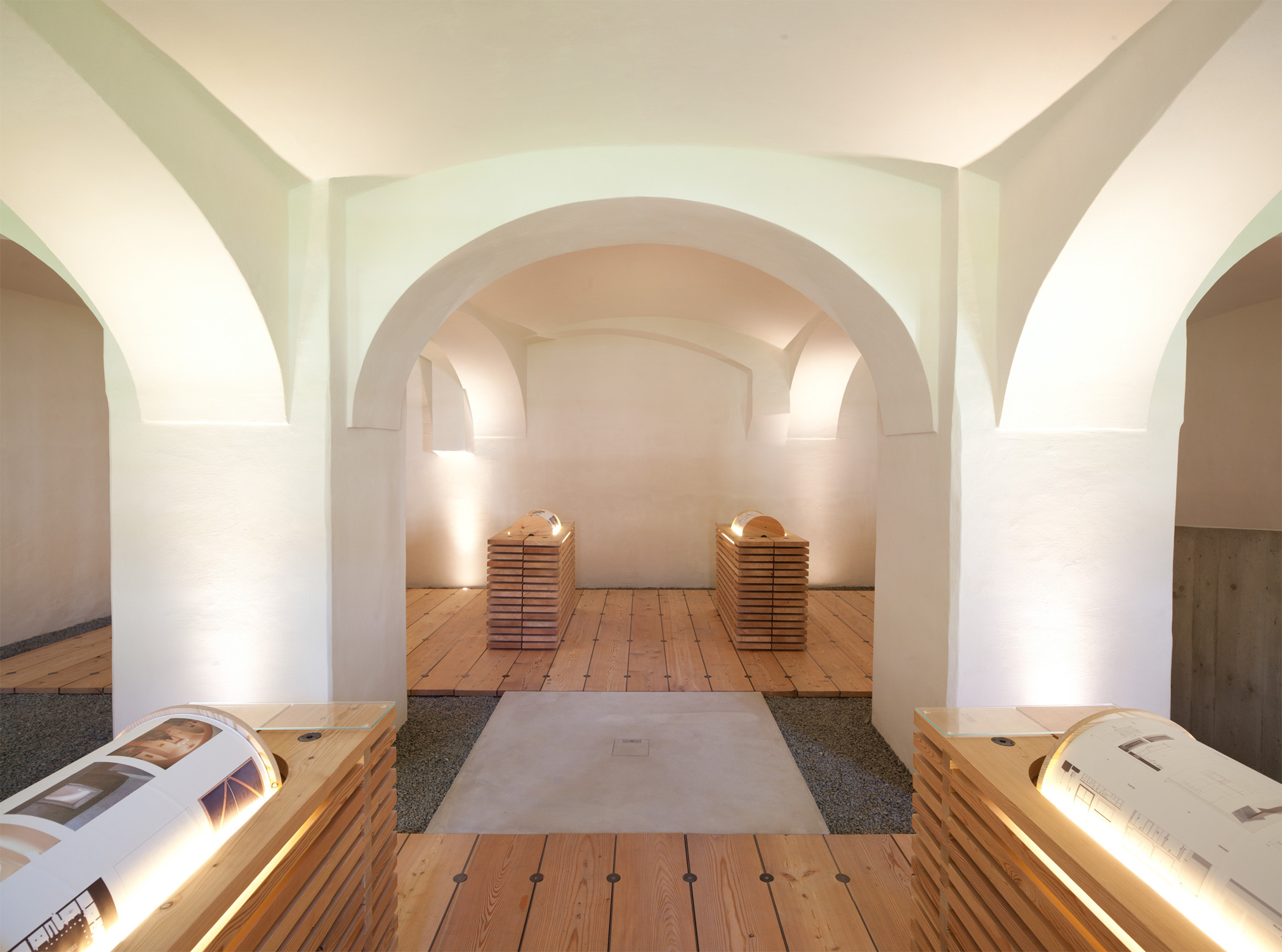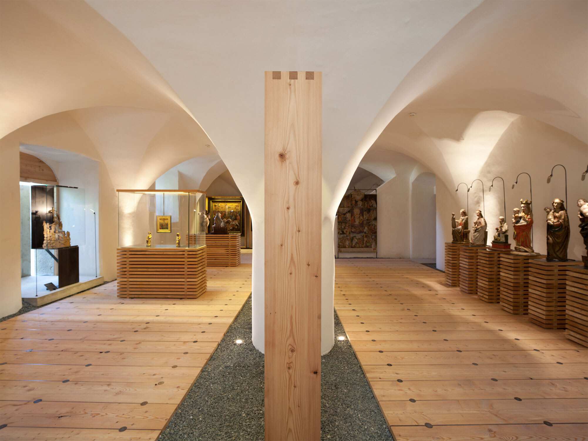 Die gotischen und barocken Gewölbe über teils mächtigen Säulen wurden restauratorisch behandelt, aber weder für die Präsentation noch für die erforderliche technische Infrastruktur angetastet. Der Unschärfe des historischen Bestands – es scheint keinen einzigen rechten Winkel in Wand und Decke zu geben – begegneten die Architekten mit der Stringenz ihres Ausstellungskonzepts. Das zeigt sich in einem Fußbodenaufbau, der sich in allen Räumen ohne aufwendige Anpassungsarbeiten installieren ließ. Neue Holzböden aus Lärchenbohlen wurden wie massive Flöße in die Lehmböden verankert – mit Abstand zu den Wänden und in denselben Brettmaßen. Zwischenräume wurden mit dunklem Kies gefüllt, alle Kabelstränge in den geschütteten Randzonen versteckt. Konsequent in Ortbeton wurden hingegen die wenigen fixen Adaptierungen wie Übergänge, der Ausgleich von Höhenunterschieden und Geländerbrüstungen ausgeführt. In den Möbeln setzt sich das Konzept der Einschränkung auf wenige hochwertig verarbeitete Materialien fort: Sockel und Vitrinen als Präsentationsflächen, Rahmen und Pulte sind aus den gleichen Lärchenbohlen gefertigt – nur diesmal gestapelt und mit Zinken zusammengesteckt. Was nur auf den ersten Blick einfach, vielleicht etwas massiv wirkt, erweist sich bei genauerer Betrachtung als subtil und fein ausgearbeitetes Baukastensystem, das vielfache Abwandlung erlaubt, ohne dabei Charakteristik und Wiedererkennungswert zu verlieren.