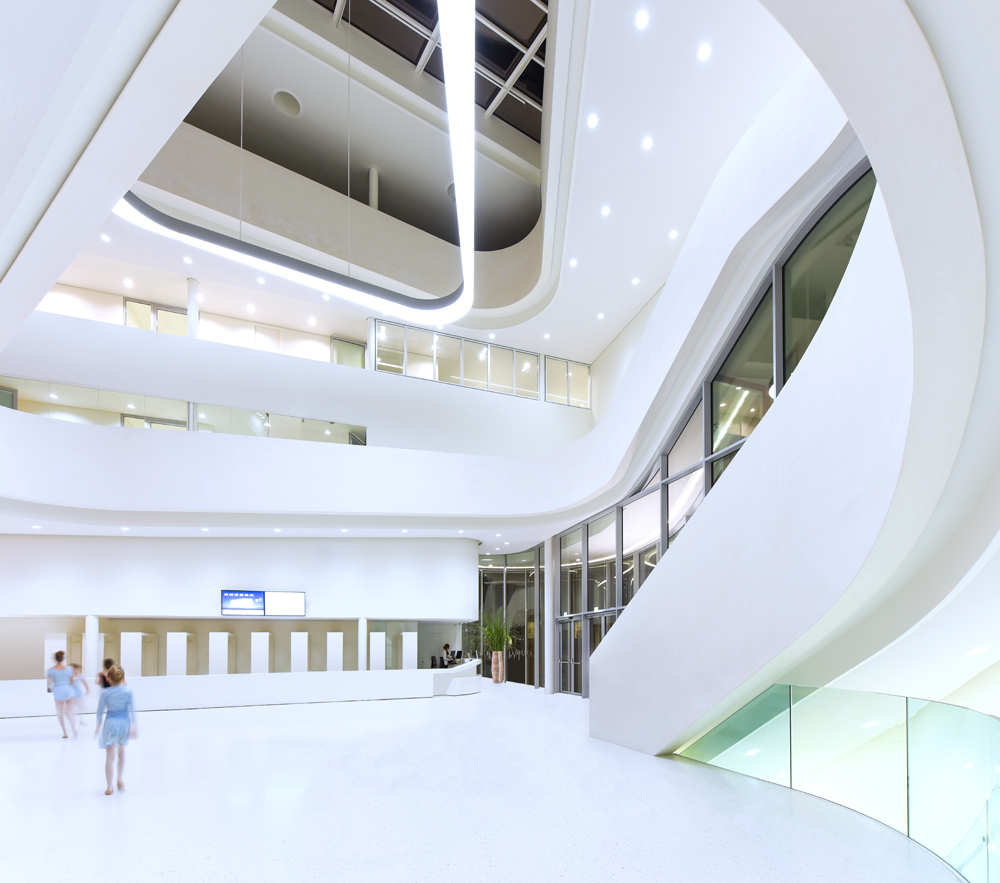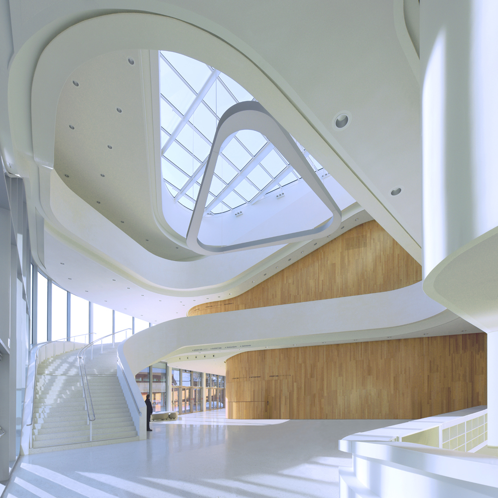 Großzügige Glasflächen markieren den Haupteingang, der unmittelbar in die freie Foyerlandschaft leitet. Ein über alle Geschosse zusammenhängendes Raumkontinuum mit Galerien, flexibel zuschaltbaren Mehrzweckflächen, vielfältigen Blickbeziehungen und einer riesigen Oberlichtverglasung, wird über die großzügige Treppenskulptur erschlossen. Weiße Kalkglätte (eine abwaschbare Spachtelung aus gebranntem Kalk, Olivenöl und Seife), Handlauf in weiß lasiertem Holz, auf der Unterseite LED Lichtbänder sind Materialisierungen der Umwehrungen; am Boden, fugenloser Betonterrazzo; Wände der Seminar- und Verwaltungsräume in weißem Anstrich. Nur der Große Saal ist außen wie innen mit Birnenholz verkleidet. Der im Galeriebereich zuschaltbare Kleine Saal bleibt golden gefärbt, die erdgeschoßigen Mehrzweckräume Bronze. Bodenbelag in diesen Räumlichkeiten ist einheitlich weißlicher Eichen-Stabparkett. Pop-Konzerte mit 3000 Leuten sind ebenso möglich wie Sprechtheater oder Orchesterkonzerte mit 1100 Sitzplätzen. Ausgeklügelte Akustikmaßnahmen mit schwenkbaren Elementen im Saal und im Oberbühnenbereich verschiebbaren Vorhängen, spielen alle Stücke. Auch wegen der mobilen Podesterie (außer Galerie) und Bestuhlung bleibt man flexibel.