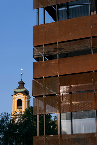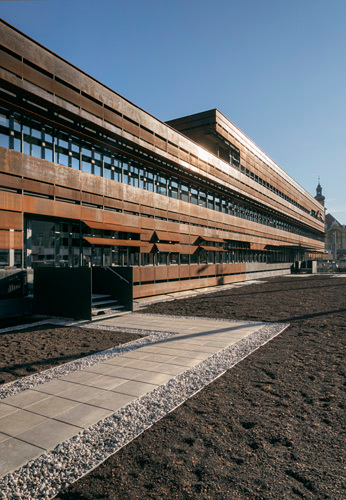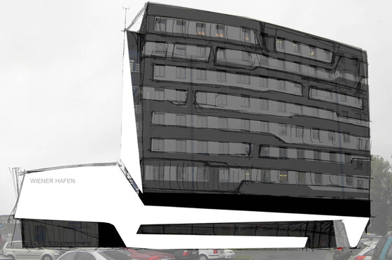 Aus städtebaulichen Überlegungen heraus setzte er einen aus den Flucht- bzw. Bezugslinien der Umgebung entwickelten Baukörper direkt an die Straße. Er übernimmt vom Bestandsgebäude lediglich das Untergeschoss und setzt darüber ein zum Teil dreigeschossiges Gebäude, das im Osten weit über die Gleise der Straßenbahn auskragt. Diese markant ausgebildete Gebäudeecke über der Einfahrt ins Betriebsgelände inszeniert den Eingangsbereich und schafft gleichzeitig eine symbolische Verknüpfung zwischen Funktion und Identität des neuen Bürogebäudes.