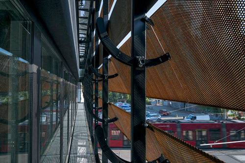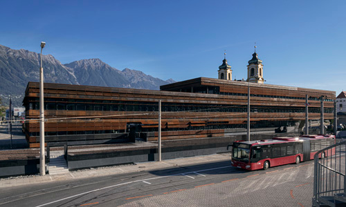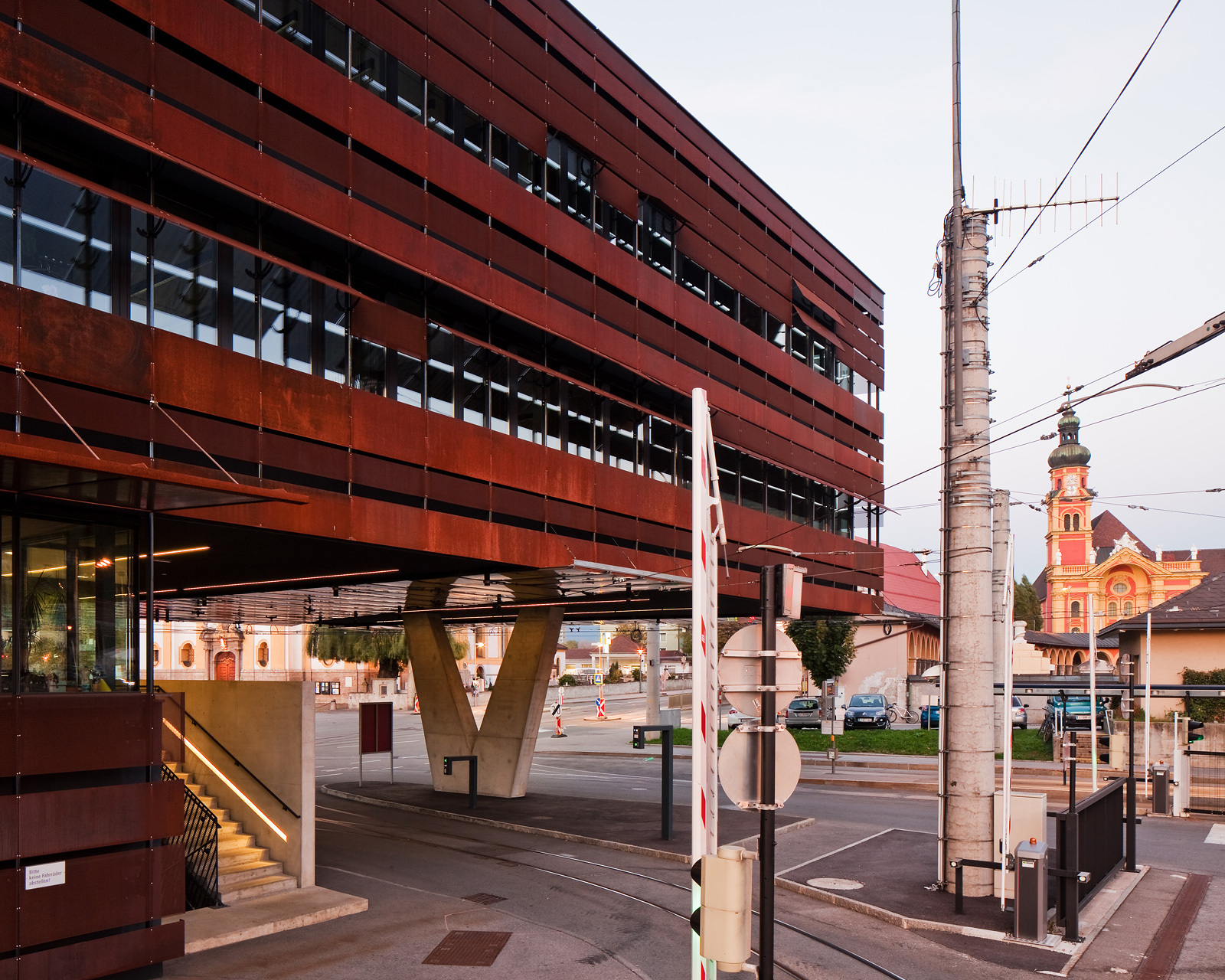 In enger Zusammenarbeit zwischen der IVB und dem Architekten ist ein Gebäude mit dezidiert industrieller Anmutung entstanden, das die Funktion der Verkehrsbetriebe auch zum Ausdruck bringen sollte. Dieser Grundidee des „Arbeitens in einer Fabrik“ entspricht sowohl die vorgehängte Fassade aus unterschiedlich gelochten Cortenstahlplatten, als auch die Werkstattatmosphäre im Innenraum, wo sämtliche Materialien möglichst „roh“ und unverkleidet belassen wurden. Der Boden ist in Estrich ausgeführt, die Decken und Zwischenwände in Sichtbeton, Trennwände aus Profilitglas bzw. zementgebundenen Spanplatten. (Text: Claudia Wedekind)