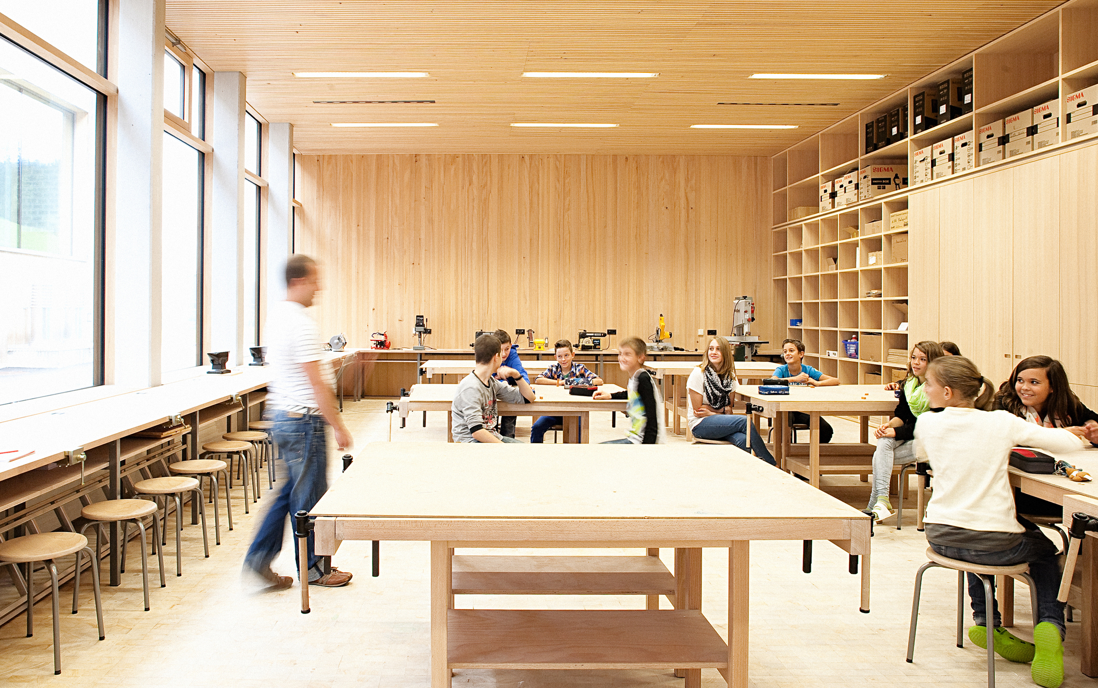 Die Umstrukturierung der Klassen folgt dem pädagogischen Konzept, das Direktor Arno Eugster mit dem LehrerInnenkollegium erstellte. Jeder Jahrgang wird in einer Lernlandschaft zusammengefasst, mit drei Klassenzimmern, einem offenen Arbeitsbereich mit Computerplätzen, Unterrichtsmaterialien und eigenen Sanitärräumen. Das funktioniert einfach durch die Auflösung einer Klasse und Integration der Gangflächen. Farbgebung und zurückhaltende Materialisierung - Boden sägerauhe Esche, Wände und Einbaumöbel aus Weißtanne - schaffen eine ruhige Atmosphäre. Aber auch die Akustik ist wichtiger Teil des angenehmen Lernklimas.