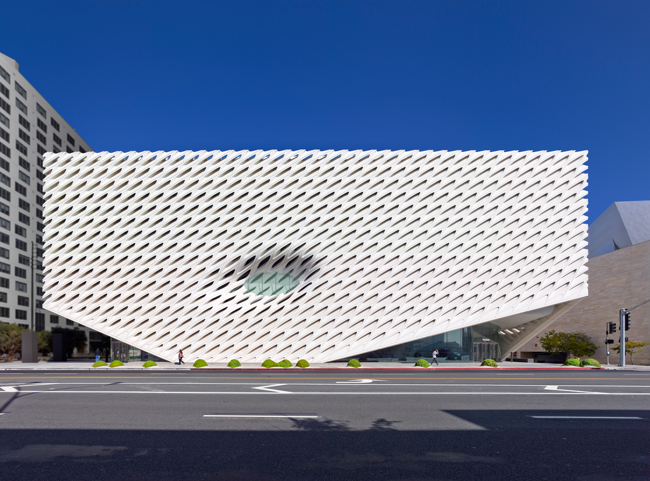 An all den neuen Kulturbauten – Walt Disney Concert Hall 2003, Cathedral of Our Lady of the Angels 2002, Ramon C. Cortines School of Visual and Performing Arts 2002 etc. – war der Immobilienmogul, Mäzen und Kunstsammler Eli Broad beteiligt. Um seine Person und Sammlung ranken sich Gerichtsprozesse und illustre Geschichten. Hat er doch in den letzten Jahren erst das MOCA finanziell vor dem Bankrott gerettet, nur um nun – als direkte Konkurrenz zu diesem – auf der gegenüberliegenden Seite sein eigenes Museum zu bauen. Wie es gelingen kann, dass sich das Gebäude von seinen Nachbarn absetzt und sich gleichzeitig in die von ihm mitgeprägte Kulturmeile einpasst, war eine der Aufgabenstellungen an die fünf Architekten, die Broad 2010 zum Wettbewerb eingeladen hatte. 2011 beauftragte er die New Yorker Architekten Diller Scofidio Renfro mit dem Projekt und gab ihnen damit den Vorrang vor Rem Koolhaas, Herzog & de Meuron, Christian de Potzamparc und SANAA.