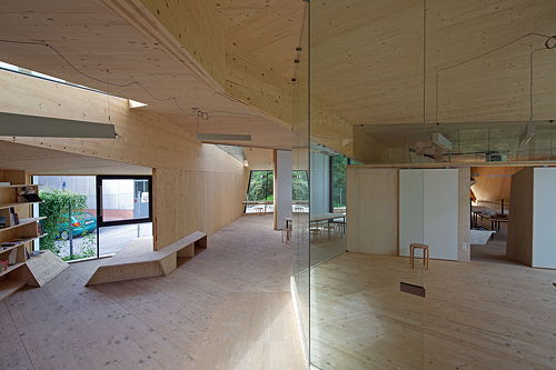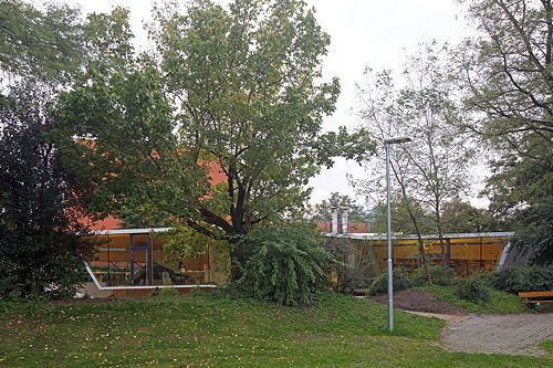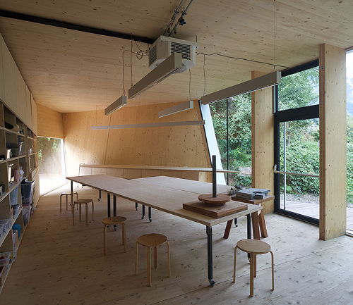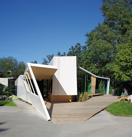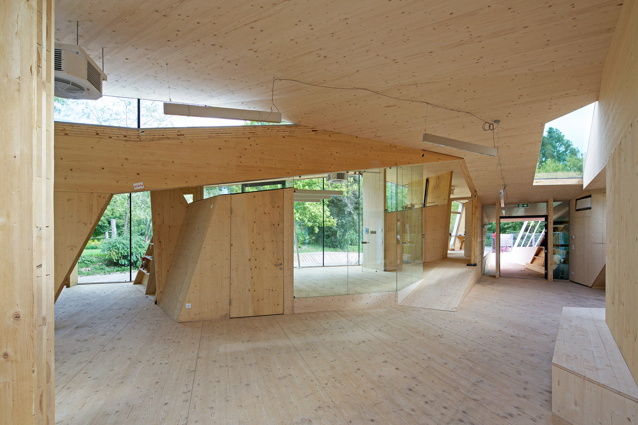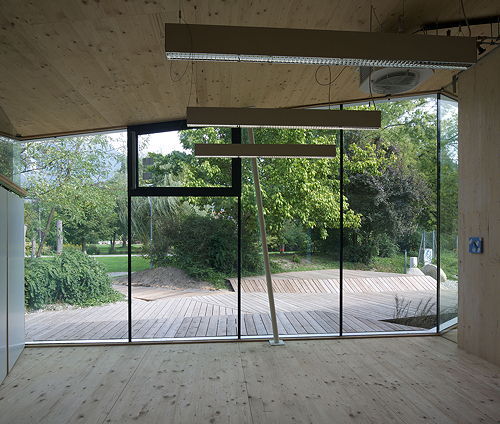 Entstanden ist ein pavillonartiges Werkstättengebäude, das nicht nur den Kindern und Jugendlichen als Nutzer:innen ein optimales Raumangebot bietet, sondern auch den Park durch seine einzigartige Architektur bereichert. Ausgehend von den unterschiedlichen Raumanforderungen entwickelten die Studierenden ein Kontinuum aus hellen, offenen, niederen und erhöhten Bereichen: eine Materialwerkstatt und eine Medienwerkstatt, ein Malatelier und ein alle Bereiche vernetzender Kommunikationsraum zum Arbeiten und Chillen, außerdem ein Büro mit Teeküche und zwei Nasszellen. Vorgelagerte Terrassen und raumhohe Glasfronten verbinden den geschwungenen Baukörper mit der Umgebung, im Inneren bilden schräge Böden und Wände einen fließenden Übergang zwischen den einzelnen Bereichen mit ihren unterschiedlichen Atmosphären und Arbeitsmöglichkeiten. Nicht nur das Werkstattgebäude selbst und die ca. 200 m² Terrassenfläche, sondern auch die gesamte Inneneinrichtung wurde von den Studierenden geplant und umgesetzt.