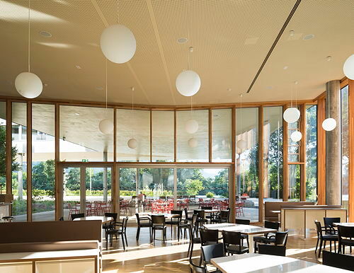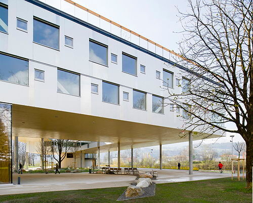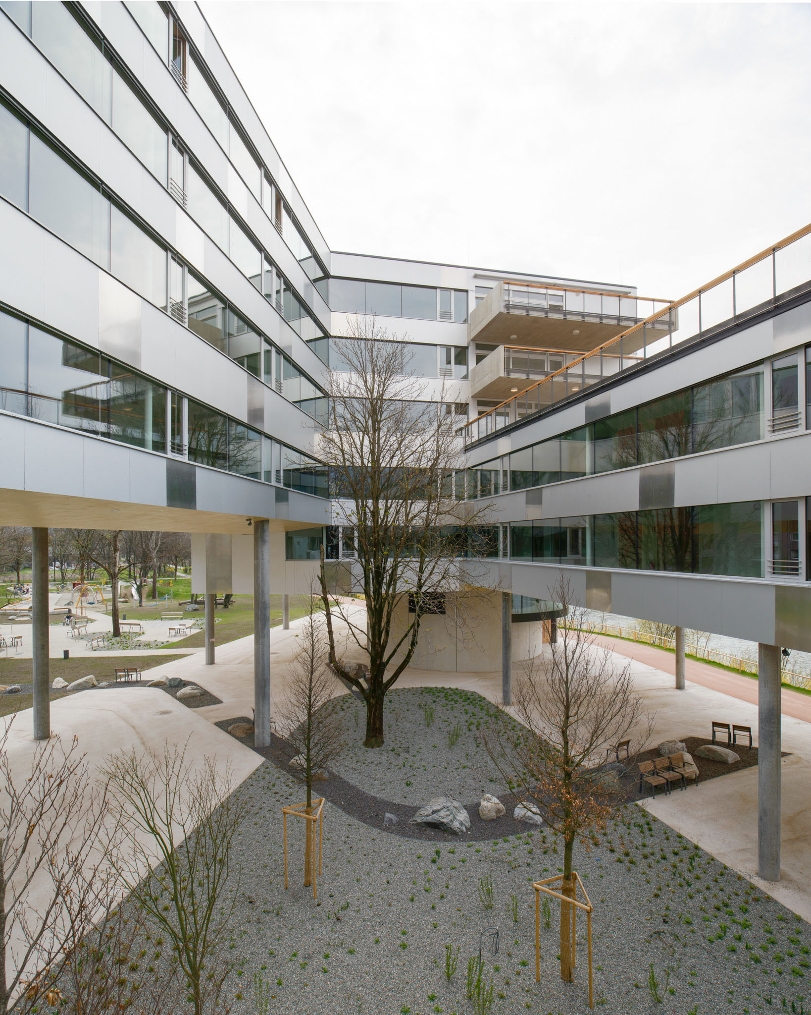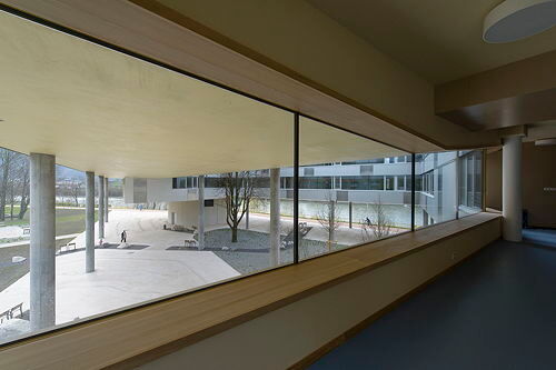 Bettina Götz und Richard Manahl (Artec) konnten den Wettbewerb für das Projekt mit der Erfindung eines neuen Bautyps für sich entscheiden. Sie ersetzen den eingeschoßigen, linearen Bestandsbau durch ein Gebäude im alten Umriss und situieren an dessen Ende – genau am Übergang zur Uferpromenade – ein sechs Geschoße hohes Gelenk mit Treppenhaus und Lift. An dieses Gelenk schließen die Zimmertrakte an: Ein zweigeschoßiger Trakt folgt zuerst annähernd der Richtung des alten Bestandsbaus, schwenkt dann aber nach einer Wendung um 90 Grad in den Uferverlauf des Flusses ein. Ein höherer Trakt mit fünf Geschoßen zweigt gleich am Gelenk in einem Winkel von 45 Grad ab. Beide Trakte treffen sich in einem weiteren Erschließungsgelenk, wodurch ein dreiecksförmiger Hof entsteht, zu dem hin alle Erschließungsgänge der Zimmertrakte orientiert sind. Das Besondere an diesem Hof ist, dass er keinen Boden hat: Beide Zimmertrakte schweben mindestens fünf Meter, stellenweise bis zu acht Meter über dem Niveau der Uferpromenade und werden von nur neun zarten Stützen und einem kleinen runden Baukörper getragen, wodurch der Blick unter dem Gebäude hindurch fast ungehindert erhalten bleibt. Die kongeniale Freiraumgestaltung von Auböck und Kárász, die nicht nur das unmittelbare Umfeld des Heims, sondern einen längeren Abschnitt der Uferpromenade bearbeiten durften, verstärkt diesen Effekt durch die raffinierte Organisation von Wegen und Pflanzen.