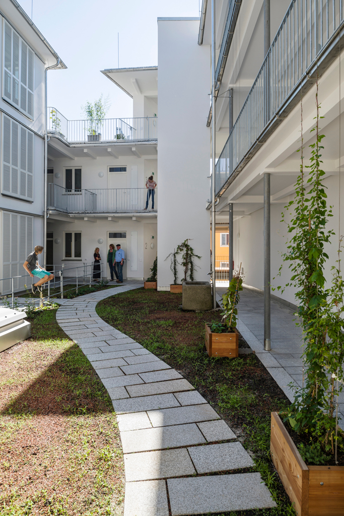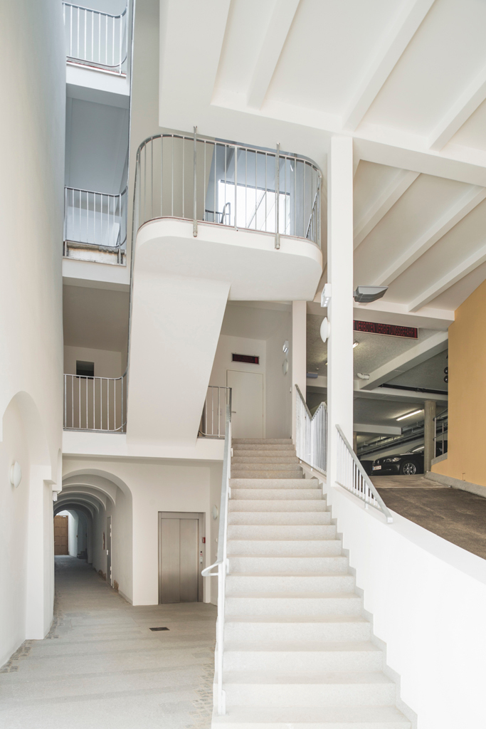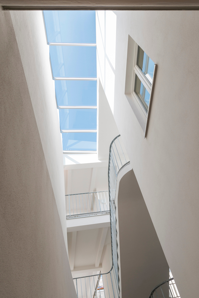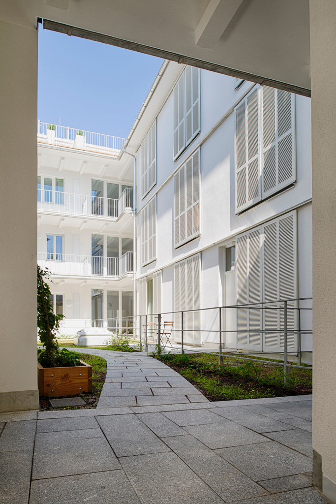 Im Bereich der Garagenauffahrt und des Durchhauses an der westlichen Grundgrenzehält der Neubau bewusst Abstand zum Nachbarn und gibt über eine große Öffnung den Blick ins Innere des Hauses frei: Tageslicht fällt von oben in die historische Passage; neben der Rampe steigt das neue Stiegenhaus in die Höhe; und über dem Rhythmus der Decke ahnt man im Hintergrund das lichte Volumen des Innenhofes. Der Hof gibt dem Haus eine kommunikative Mitte, die von seinen Bewohnern auch für gemeinsame Aktivitäten genutzt wird. Mit seinen Laubengängen, Nischen, Balkons weckt er die Erinnerung an historische Beispiele, ohne sein Entstehungsdatum zu verschleiern. Die Wahl derMaterialien – weiß verputztes Ziegelmauerwerk, Naturstein und Holz für die Böden der Aufenthaltsräume – vermittelt ebensolche Gediegenheit wie die sorgfältig auf größtmögliche Schlankheit ausgelegten Details.