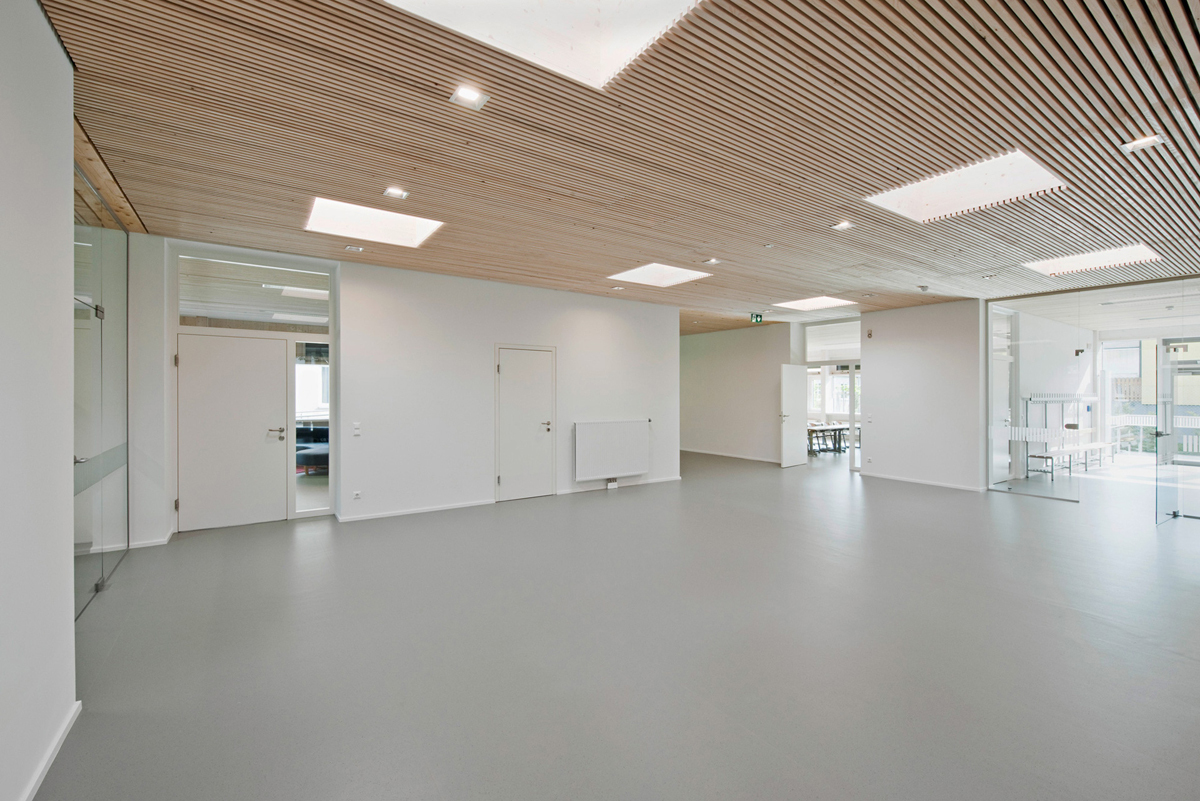 Aufgrund der mangelnden Speichermassen im Holzbau wird die erforderliche Kühlung mittels Nachtlüftung durch Querlüftung sichergestellt. Oberhalb der Fenster wurden manuell bedienbare Klappflügel (regen- und einbruchssicher) ausgeführt. Der letzte Nutzer am Abend öffnet die Klassentüren und die Klappen, der erste am Morgen schließt sie wieder.