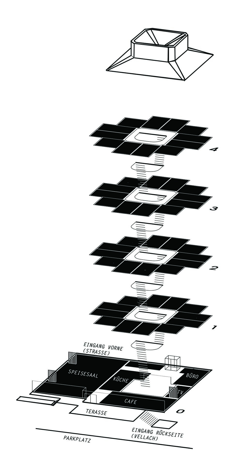 Dabei ist das Obir eindeutig maßgeschneidert für seinen Ort. Schließlich war Ilja Arnautović kein anonymer Zeichenknecht, sondern ein längst etablierter Architekt, der sich mit ganzen Stadtvierteln, etwa in Ljubljana, einen Namen gemacht hatte. Auch das Hotel Obir birgt eine Fülle von Raffinessen: Im Erdgeschoß ein offenes Raumkontinuum, das für Restaurants und Feste aller Größen einteilbar war, darüber schwebt der vierstöckige Bettentrakt, oben und unten zur Pyramide abgeschrägt, was ihm etwas so Elegantes wie Raumschiffhaftes verleiht, die über Eck gezogenen Fenster der Zimmer bieten den Urlaubern weite Ausblicke ins schmale Tal. Ein Schweben über den Gräben, ein Zeichen des Optimismus. Und tatsächlich wurde das Hotel in den Folgejahren zum Zeichen der Versöhnung.