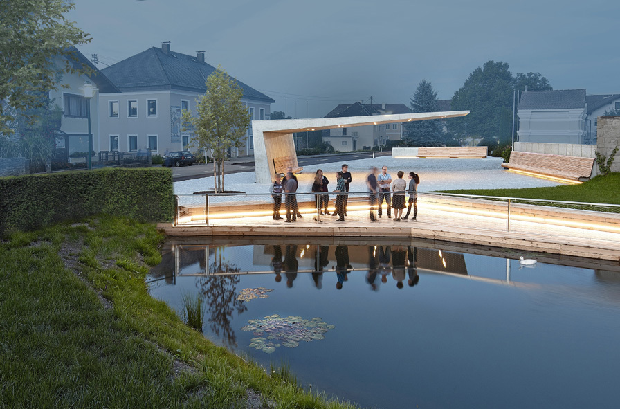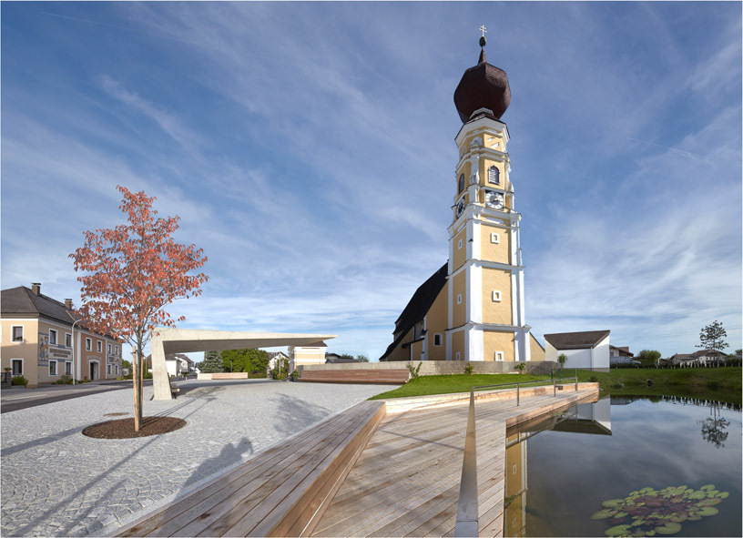 Wesentlich wichtiger noch als die Gestalt des Flugdachs ist seine konzeptionelle Einbindung in den städtebaulichen, aber auch politischen Gesamtkontext. Ausgangspunkt war ein von der Gemeinde Mitte 2014 ausgelobter geladener Architekturwettbewerb für eine Fläche, die erst durch den ein Jahr zuvor erfolgten Abbruch des nicht erhaltenswerten »Lamprechthauses« entstand – ein Altbau, der den westlichen Kirchenvorplatz zwischen Friedhofsmauer, Landesstraße und dem damals völlig überwucherten Teich besetzte. Die in der Auslobung formulierten Ziele, »die Nutzungsmöglichkeiten gemeinschaftlichen Lebens und Begegnens im öffentlichen Raum zu stärken« und einen neuen »Mittelpunkt des Dorfgeschehens« zu schaffen, erfüllte das siegreiche Projekt des Linzer Architekten Andreas Heidl am besten. Er sah eine einheitlich gepflasterte Platzfläche vor, die durch lang gestreckte Holz-Sitzbänke, den neu in Szene gesetzten Teich und das am ehemaligen Standort des Lamprechthauses platzierte Flugdach in drei Bereiche gegliedert wird.