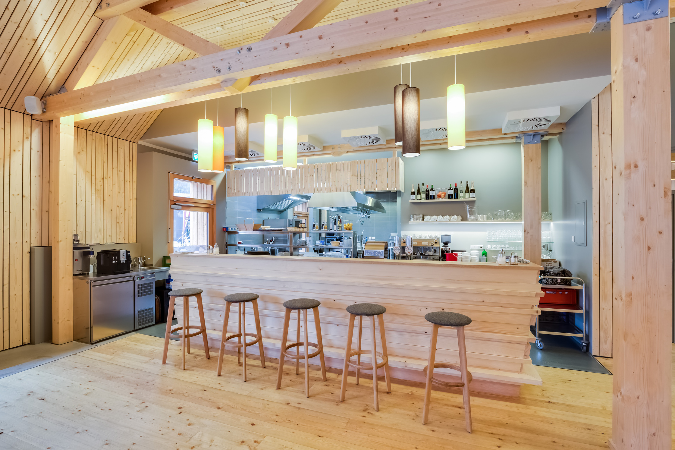 Ein Pelletsofen und ein Stückholzofen versorgen die Aufenthaltsbereiche mit Wärme. Die Wärmeerzeugung der Fußbodenheizung erfolgt durch eine Luft-Wasser-Wärmepumpe, die wiederum durch eine Photovoltaikanlage gespeist wird. Küchenabluft dient zur Wärmerückgewinnung.