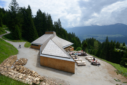 So wie die Stadt mit den Architekten die richtigen Partner für die Umsetzung ihres Slogans alpin | urban gefunden hat, so hat sich bei der Gastronomieausschreibung auch das passende Konzept der Vollblutgastronomin Sonja Schütz durchgesetzt: Ihre Speisekarte orientiert sich an traditionellen Gerichten der Region, die üblichen Fertigprodukte kommen bei ihr nicht auf den Tisch, alles wird aus möglichst regionalen Zutaten frisch gekocht, gebacken, zubereitet. Mit der hohen Qualität, die freilich ihren – keineswegs zu hoch angesetzten – Preis hat, überzeugt sie auch die zunächst skeptischen Gäste, die von anderen Bergstationen schnelle, billige Dutzendware gewohnt sind. Die warmherzige, zupackende Wirtin verbringt mit ihrem Lebenspartner ganze Wochen auf der Alm, die kleine Wohnung im UG bietet dazu die nötigen Schlafplätze. Das übrige Personal nimmt bisweilen täglich den steilen Aufstieg in Kauf; das Befahren der Waldwege wird so gut wie niemandem erlaubt, Stellplätze gibt es ohnehin nur für die Pächter selbst.