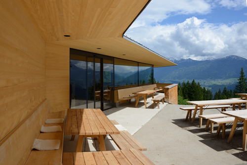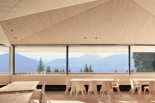 Dünne, schwarze Stützen innen vor der Dreischeibenverglasung gewähren maximale Aussicht: ein nahezu 180° umfassendes Panorama Wald-Tal-Berge, vom auskragenden Dach beschattet und gerahmt, über die Stadt, zur Bergisel-Schanze und weit darüber hinaus. Ein räumlicher Kniff verhindert, dass die Horizontalität die Oberhand gewinnt: Die zur Raummitte hin ansteigende Zeltform der Decke mündet in eine bergende Geste und schafft Konzentration in den Raum hinein statt zur Aussicht hin. Man mag den Begriff kaum benutzen, aber der Rezensent fand es dort schon sehr gemütlich und blieb auch deutlich länger sitzen als geplant – um die sauberen Details und die unauffällig integrierten Ideen zu studieren, wie z. B. eine die Fensterseite begleitende Bank (jeder will immer am liebsten auf der Bank sitzen), das Fugenbild oder die Lüftungsleiste zwischen Fassade und Decke, die auf die Komfortlüftung mit Wärmerückgewinnung und somit auf den nachhaltigen Betrieb verweist, der dem ganzen Projekt abverlangt wurde. Genutzt werden auch die Abwärme von Kühlzellen und Küche – gekocht wird mit Gas. Warmwasser steuert ein Sonnenkollektor am Hang bei, das Gros der Wärme liefert die Stückholz-Heizung, unterstützt von den offenen Kaminen. Die komplexe Technik des Lüftungsgeräts ist auf einer Empore zwischen Dach und der in einer freien, von den Dachflächen unabhängigen Form abgehängten Decke untergebracht.
