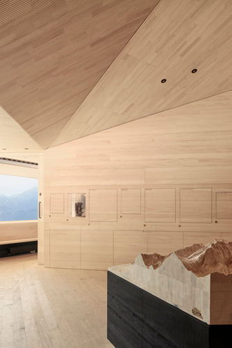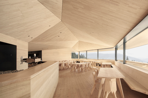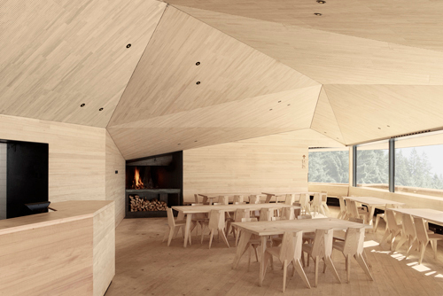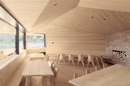 Von warmer Gastlichkeit kündet der rauchende Kamin, der die Holzfeuerung und zwei offene Kamine in den beiden Gaststuben bedient. Das Innere ist ein Traum in Holz. Die Wände sind mit bandsägerauer Weißtanne bekleidet, der Boden damit belegt. Den Anspruch an die Holzoberflächen haben die Architekten aus Vorarlberg mitgebracht und im Sägewerk auf Herzdielenschnitt mit stehenden Jahren geachtet, wie auch darauf, dass die ausführende Firma vor Ort die Herausforderungen der komplexen Deckengeometrie meisterte. Die geschlitzten Akustikpaneele aus Weißtanne sorgen für eine angenehme Hörsamkeit, die trotz der Größe des Raums nicht ins Hallige abdriftet, eine gewisse Intimität am Tisch bleibt gewahrt. Locker, aber mit geübter Hand über die Deckenuntersicht verstreute Punkstrahler, Bewegungs- und Rauchmelder ergeben zusammen mit den Stößen unterschiedlicher Holzfarben ein lebendigeres Bild als es die Fotos vermuten lassen; auf diesen wirken die Räume sehr viel »cleaner«, als das realiter der Fall ist. Der raue Charme, dem etwas Provisorisches, vielleicht sogar Werkstatthaftes anhaftet, passt gut zur rustikalen Tradition des Orts – vervollständigt durch kantige, ins Klobige tendierende, dennoch elegante Stühle und Tische nach Entwurf der Architekten. All das kann ruhig ein wenig schmutzig werden und angestoßen sein; die Patina wird dieser Neuinterpretation einer Almhütte eher gut tun und den unvorbereiteten Wanderer davon abhalten, sich dem zeitgenössischen Schick mit zu großer Ehrfurcht zu nähern.
