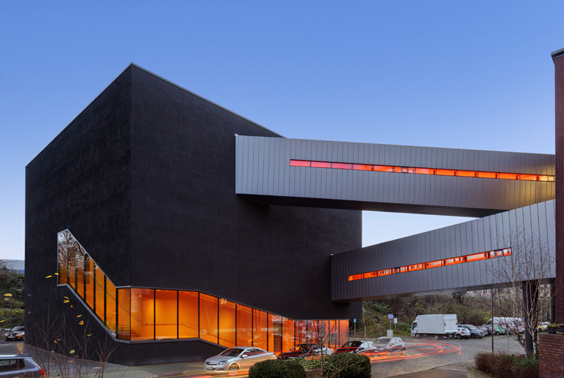 Für das Team von Benthem Crouwel (Amsterdam / Aachen), das derzeit auch den Anbau des Amsterdamer Stedelijk-Museums fertigstellt, war das majestätische Bergbaumuseum aus der Ära des Industriezeitalters, wie es von Krupp und Haniel geprägt wurde, eine Herausforderung. Als sich die Architekten 2006 an dem Wettbewerb beteiligten, wurde ihnen schnell klar, dass der Altbau nach einem expliziten Gegengewicht verlangt, was sie mit deutlichen Anleihen am Expressionismus und an der Bauhaus-Moderne zu bewerkstelligen suchten. Entstanden ist ein Anbau, der die einen an Kasimir Malewitschs Schwarzes Quadrat denken lässt. Andere, insbesondere einheimische Ruhrpottler, erinnern sich vielleicht an die Zeit der Kohlenförderung und assoziieren dabei einen «schwarzen Diamanten». Tatsächlich hat sich mittlerweile in Bochum die Redewendung vom «schwarzen Diamanten» eingebürgert. Benthem Crouwel entschieden sich für einen schwarzen Kubus, der lediglich im ersten Augenblick hermetisch wirkt. Während Farbe und Gestalt das Fördermaterial Kohle evozieren, von dem die gesamte Region seit dem frühen 19. Jahrhundert lebte, taucht gleichzeitig der Querschnitt des Bergwerks mit seinen Gängen, Stollen und Rampen vor dem geistigen Auge auf. Daran gemahnen die beiden «Bandbrücken», die den Freiraum zwischen Alt- und Neubau überspannen und sich dabei dramatisch überkreuzen. Die Architekten sparten gleichwohl nicht mit heiteren Farben, und so behandelten sie sämtliche neuen Erschliessungswege – die beiden Rampen, auf denen man zu den Wechselausstellungen im Anbau gelangt, und das neue Stiegenhaus – mit poppigem Melonengelb, bestehend aus einer Polyurethanbeschichtung des Betons.Benthem Crouwel bevorzugen kräftige Farben: Zu dem Schwarz, das auf die fugenlose raue Putzoberfläche des Museumskubus aufgetragen und mit glitzernden Siliciumcarbid- Splittern vermengt wurde, tritt also das grelle Melonengelb, das sich bestens zum expressionistischen Aspekt des Anbaus gesellt, nämlich den Zickzacklinien des Fensterbandes, die vom Erdgeschoss bis hinauf in die zweite Etage verlaufen. Die schwarze Putzfassade, die vor den tragenden Stahlbetonwänden abgehängt ist, kontrastiert auch mit der Glasfassade des Foyers. Abends, wenn die Beleuchtung angeschaltet ist, kommunizieren die Zickzacklinien mit den schmalen Fensterschlitzen der Verbindungsrampen und sorgen für anregende Farbeffekte. Bei Tageslicht entdecken die Museumsbesucher, dass sich die gezackten Fensterbänder auf dem Dach fortsetzen und den Blick auf den Förderturm freigeben.