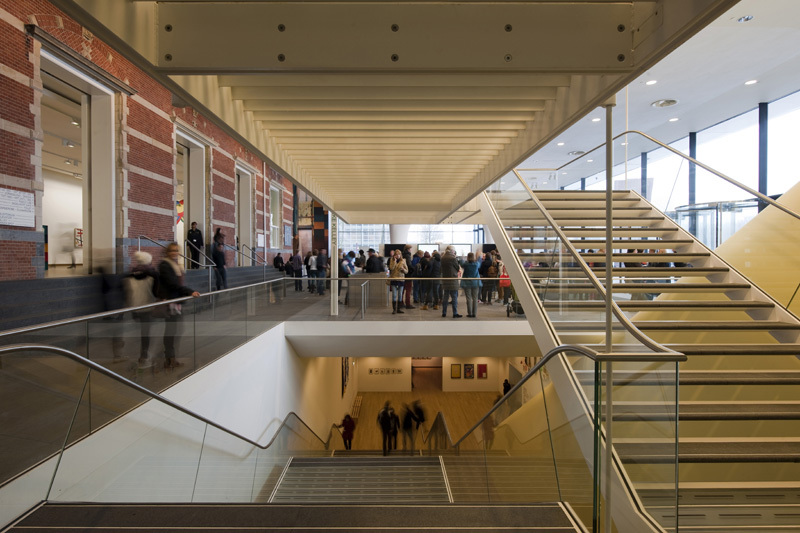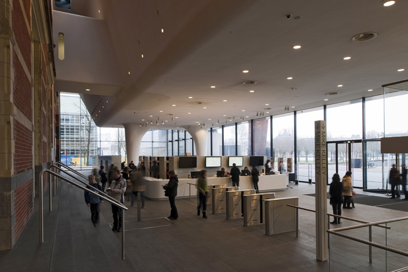 Auch sonst ist das Foyer nicht gerade die Schokoladenseite des Gebäudes, verströmt es doch aufgrund der kühlen Farb- und Materialwahl weniger Museumsflair als kühle Flughafenatmosphäre. Benthem Crouwel Architects sind vor allem als Entwerfer mehrerer Bahnhöfe und des Flughafens Schiphol bekannt. Fragt man jedoch Chefarchitekt Mels Crouwel, so ist das Foyer das Herzstück des neuen Entwurfs: „Wir wollten eigentlich vor allem einen großen Eingang mit einem Kragdach und einer besonderen Materialisierung gestalten. Man könnte beinahe übersehen, dass auch noch neue Museumssäle hinzugekommen sind.“ Dabei scheint die Gestaltung dieser Säle in ihrer Einfachheit viel gelungener. Sowohl im Alt- als auch im Neubau wurden die Räume mit weißen Wänden und Eichenholzboden versehen. Während der Übergang von Alt zu Neu von außen penetrant ins Auge springt, ist beim Ausstellungsbesuch kaum etwas zu merken. Eines muss man dem neuen Stedelijk Museum lassen: Als White Cube taugt es durchaus. Zur Eröffnung präsentiert Ann Goldstein, seit 2010 Direktorin des Museums, in den vergleichsweise kleinen Sälen des Altbaus die Sammlung in chronologischer Form, während in den 3400 Quadratmeter großen neuen Ausstellungsräumlichkeiten jeweils eine Ausstellung mit Werken zeitgenössischer Künstler zu sehen ist.