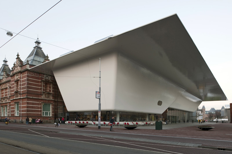 Schon die letzten 20 Jahre hatte sich der Stammsitz des Museums als zu klein und vor allem als höchst renovierungsbedürftig erwiesen. 1992 wurde daher der US-Architekt Robert Venturi mit einem Erweiterungsentwurf beauftragt. Doch als der erste Gründungspfahl in den sandigen Amsterdamer Boden gerammt war, befand man den Entwurf plötzlich für viel zu teuer. Fuchs bestellte einen kostengünstigeren Entwurf beim portugiesischen Meister der feinen Klinge, Álvaro Siza. Dieser entwarf einen Komplex aus minimalistischen weißen Kuben, die um mehrere Patios organisiert und über zwei gläserne Gänge mit dem Altbau verbunden werden sollten. Auch für diese Version fehlte das Geld. In den folgenden Jahren wartete Fuchs mit immer neuen, fruchtlosen Vorschlägen zur Finanzierung auf, bis der Stadtrat den Plan Ende 2002 endgültig vom Tisch fegte. Woraufhin der Direktor seinen Job schließlich an den Nagel hängte. Ein Jahr später musste der Altbau von heute auf morgen aus feuerpolizeilichen Gründen geschlossen werden - und hier beginnt die Geschichte um das aktuelle Haus: 2004 wurde ein Wettbewerb für die Renovierung und Erweiterung des Altbaus ausgeschrieben, aus dem Benthem Crouwel Architects mit der weißen Badewanne als Gewinner hervorgingen. Es war das mit Abstand gewagteste Projekte unter allen eingereichten Beiträgen.
