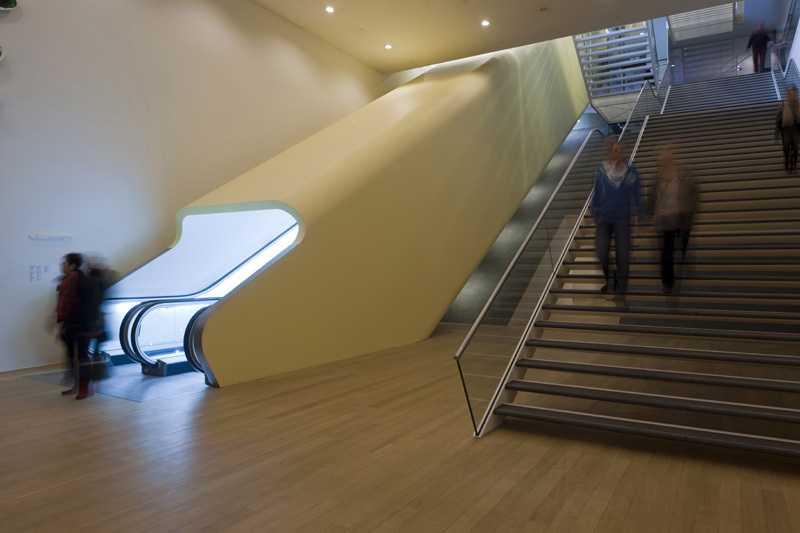 Vom Foyer aus betrachtet ist der Neubau deutlich als separates Gebäude erkennbar. Der Altbau wird nur an wenigen Stellen berührt. Im Untergeschoß, das sich bis unter den Vorplatz erstreckt, liegen ein großer Ausstellungssaal, die Bibliothek sowie ein Infozentrum. Von dort führt eine lange Rolltreppe direkt ins Obergeschoß, wo sich ein weiterer Ausstellungssaal befindet. Im Foyer tritt der Rolltreppen-Schacht als rätselhafte gelbe Röhre in Erscheinung. Etwas ungelenk durchkreuzt sie den Raum.