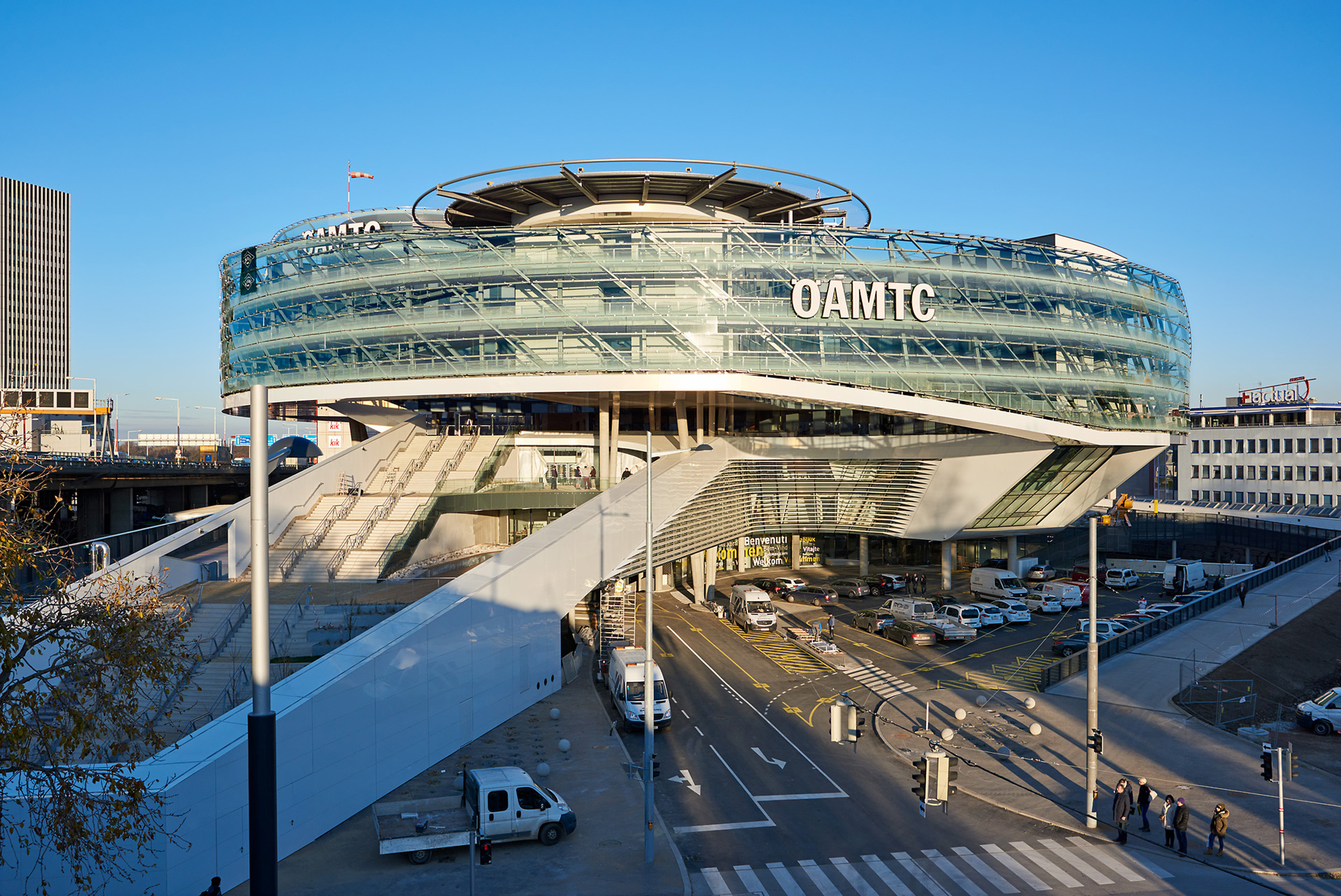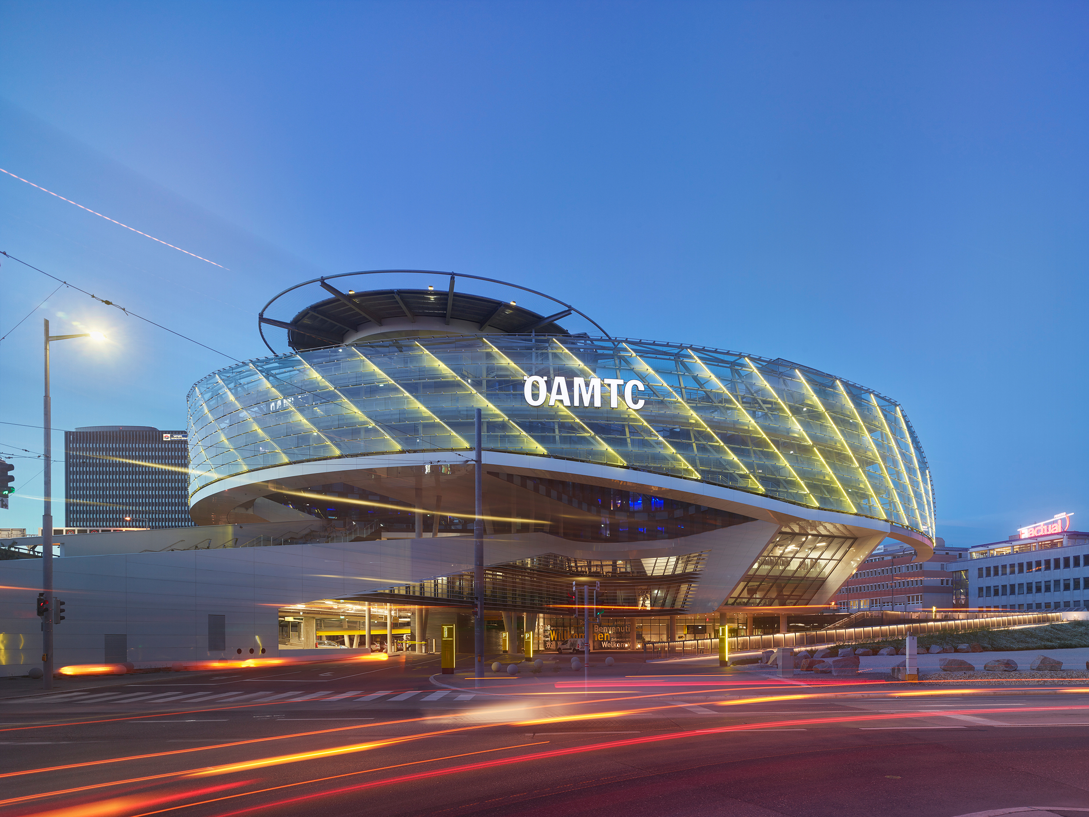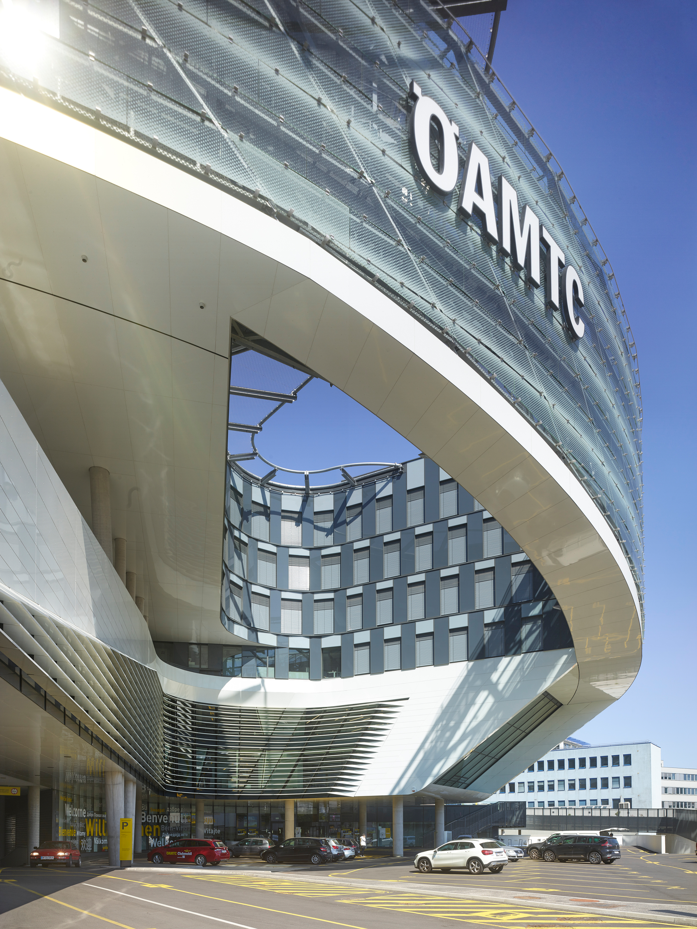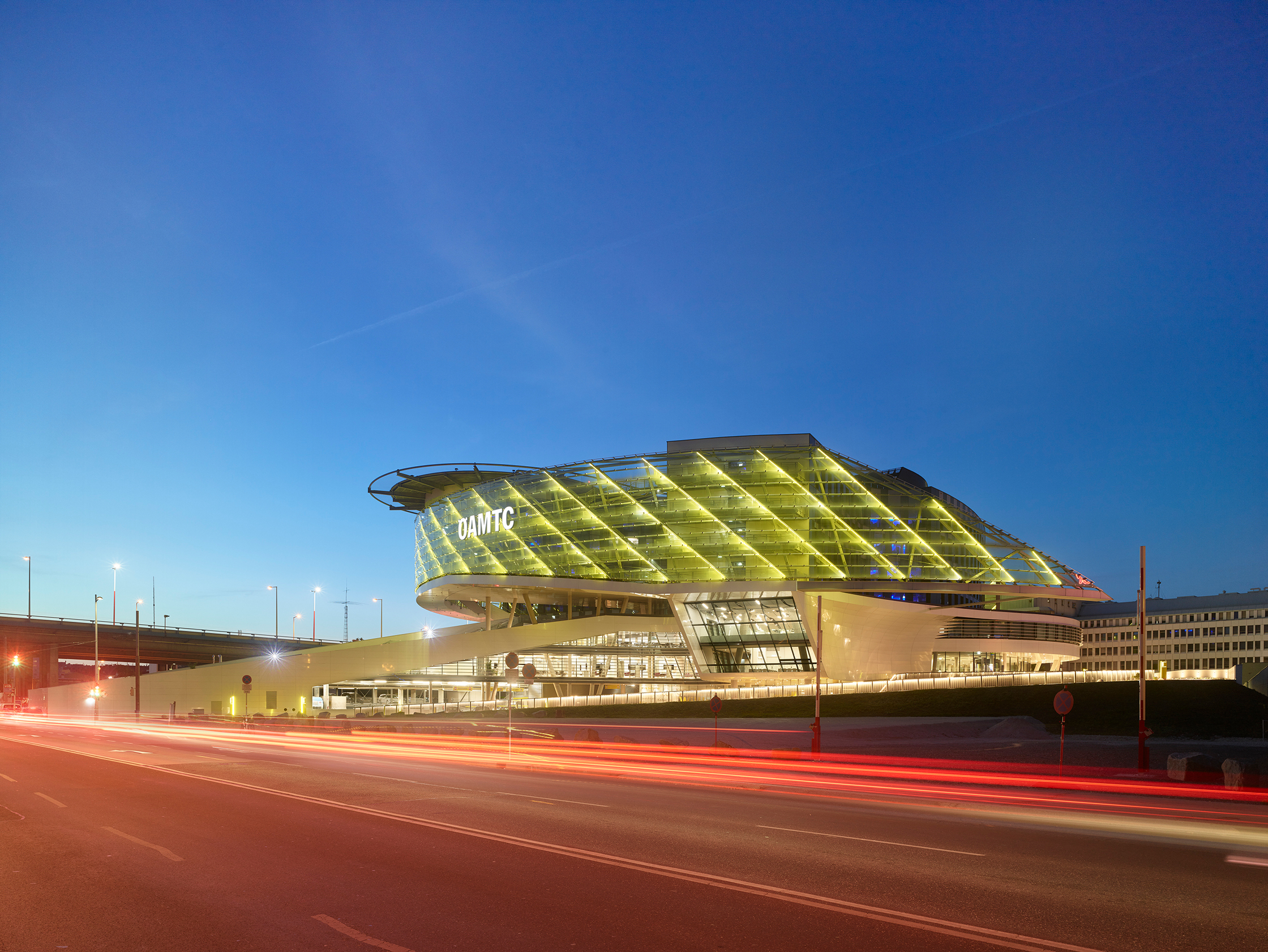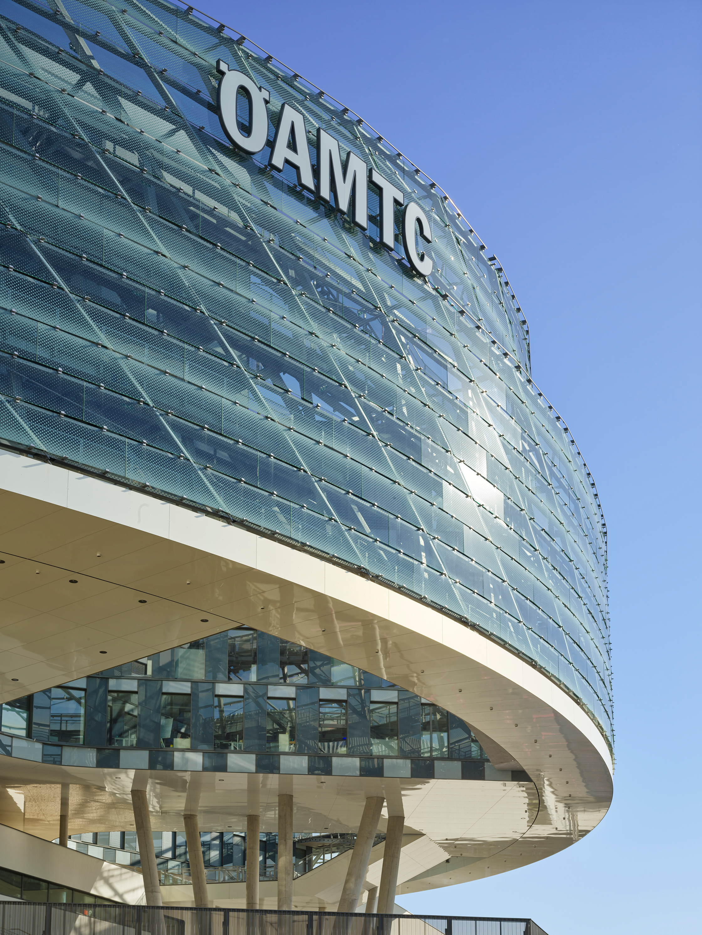 Für eine solche Institution im Umbruch ein neues Hauptquartier zu entwickeln ist eine spannende Aufgabe. Als der ÖAMTC im Jahr 2013 einen geladenen Wettbewerb ausschrieb, war bewusst nicht nur der Entwurf für einen Bürobau gefragt, sondern für ein „Mobilitätszentrum“, das die verschiedenen Dienstleistungen des ÖAMTC zusammenführen sollte: das Kfz-Service, ein Reisezentrum, ein Callcenter, das zentrale Management, ein Fortbildungszentrum mit Vortragssälen, die Redaktion der diversen vom ÖAMTC betriebenen Medien und schließlich einen Hubschrauberlandeplatz mit Garage auf dem Dach des Gebäudes.