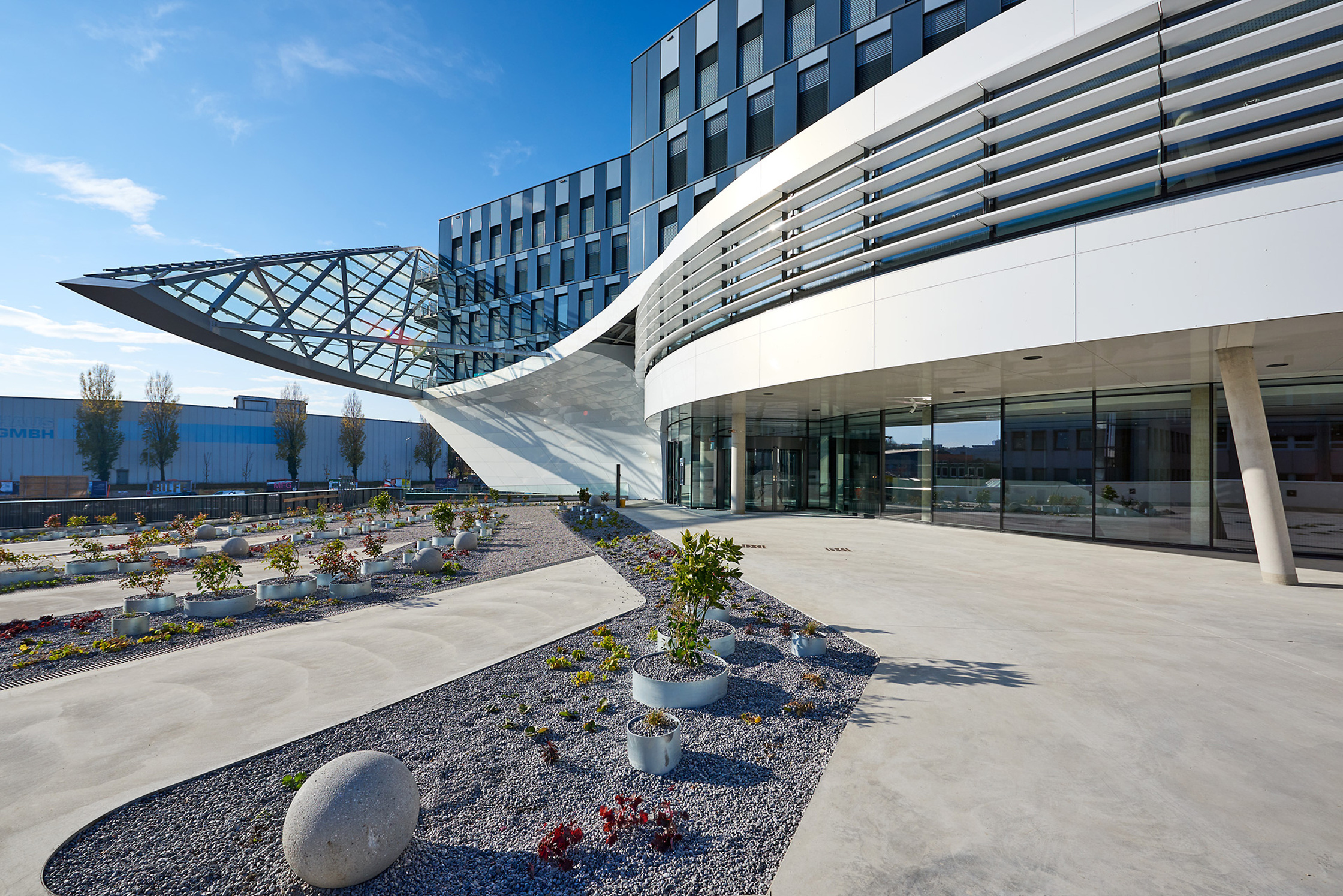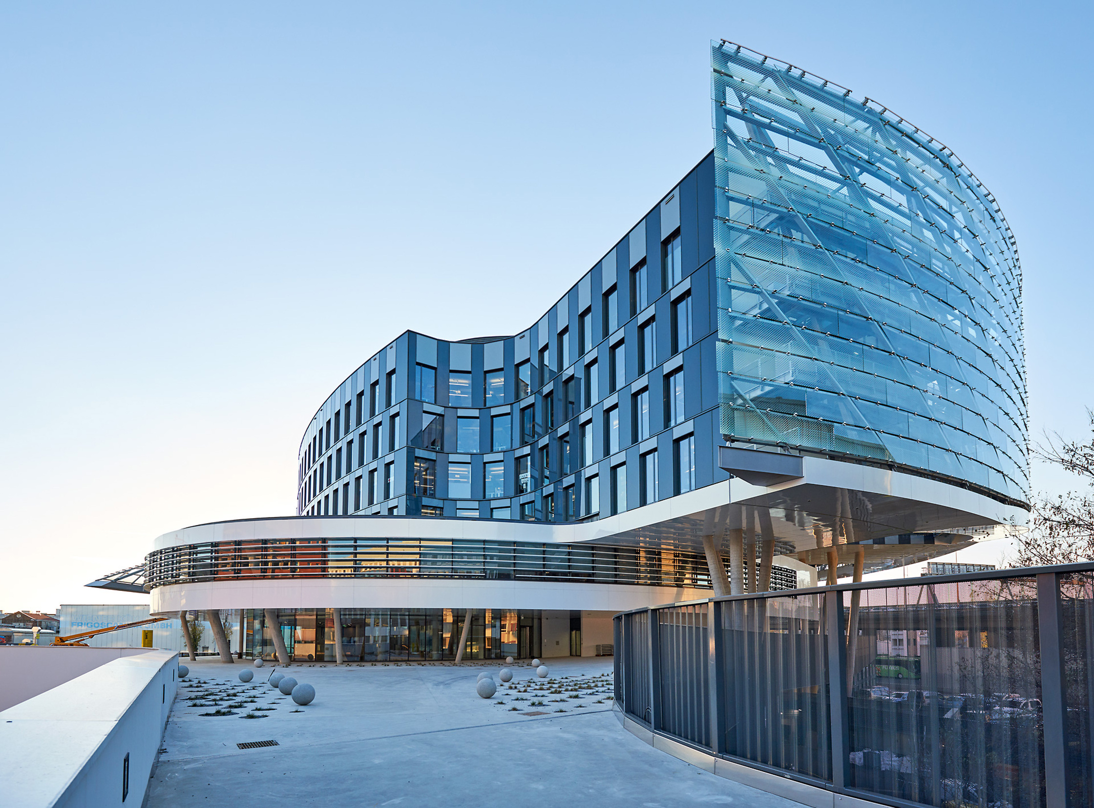 Das nach außen auffälligste Merkmal des Gebäudes ist die vorgesetzte geschwungene Glaswand, die um drei Viertel des Gebäudes läuft. Sie ist sowohl Schallschutz als auch Fluchtweg mit eingebauten Treppen, die kaskadenartig von den Bürogeschoßen nach unten führen. Das Erweiterungskonzept des Hauses sieht vor, die fünf Arme des Seesterns um zwei zusätzliche zu ergänzen und dann auch die Glaswand um das gesamte Gebäude herumzuführen.