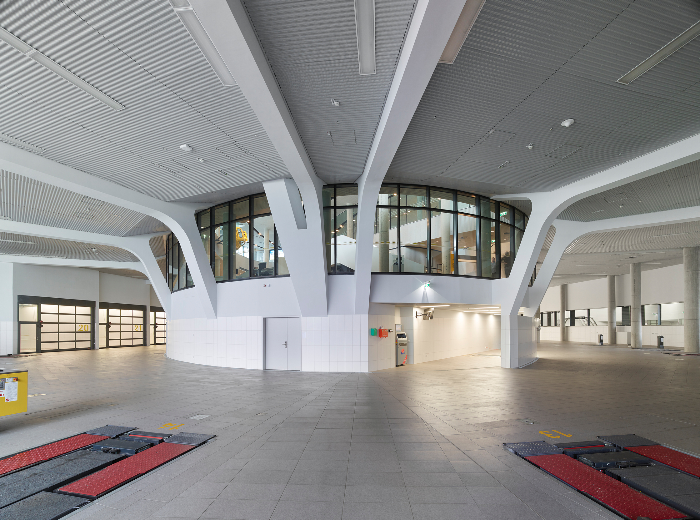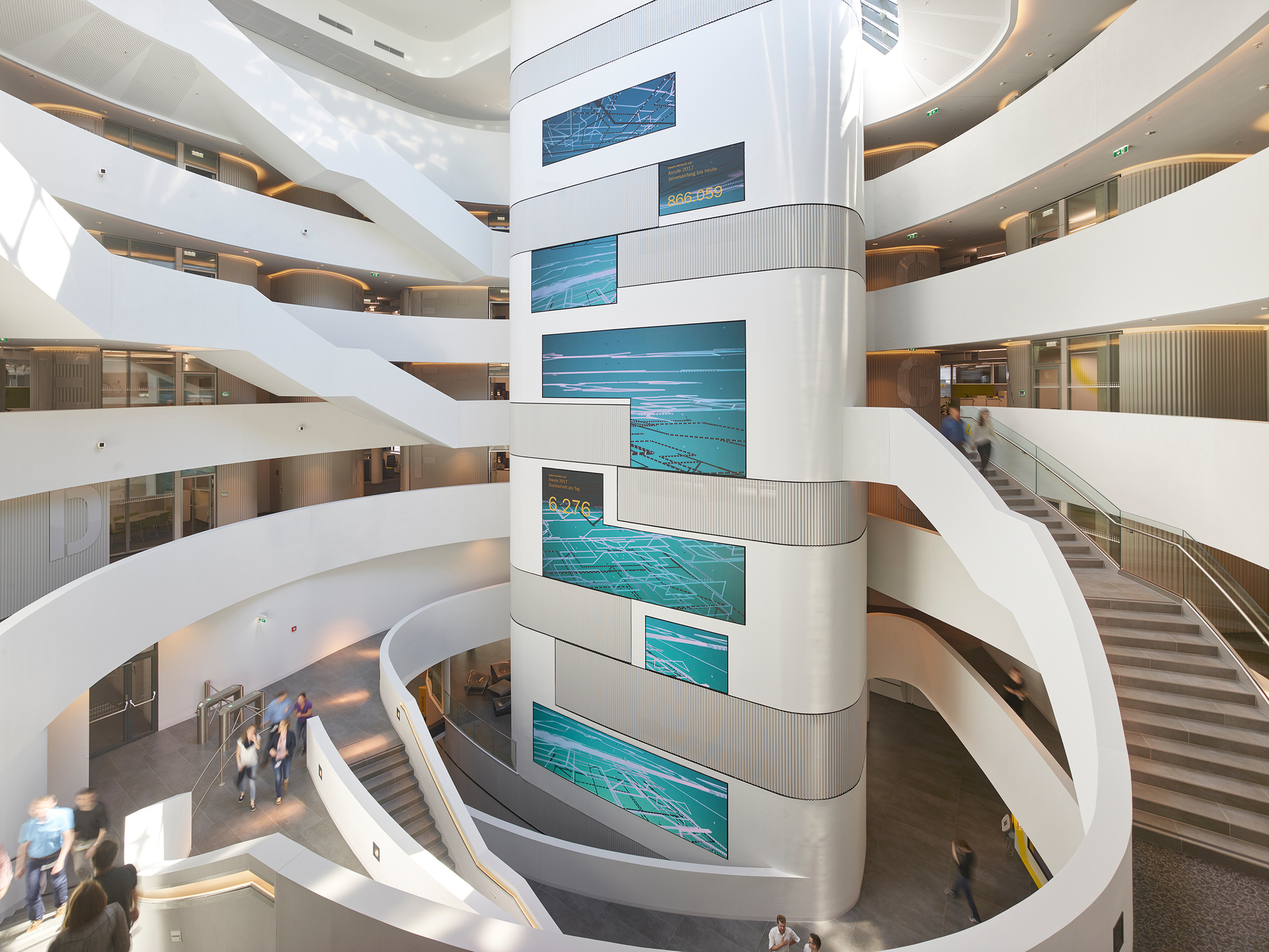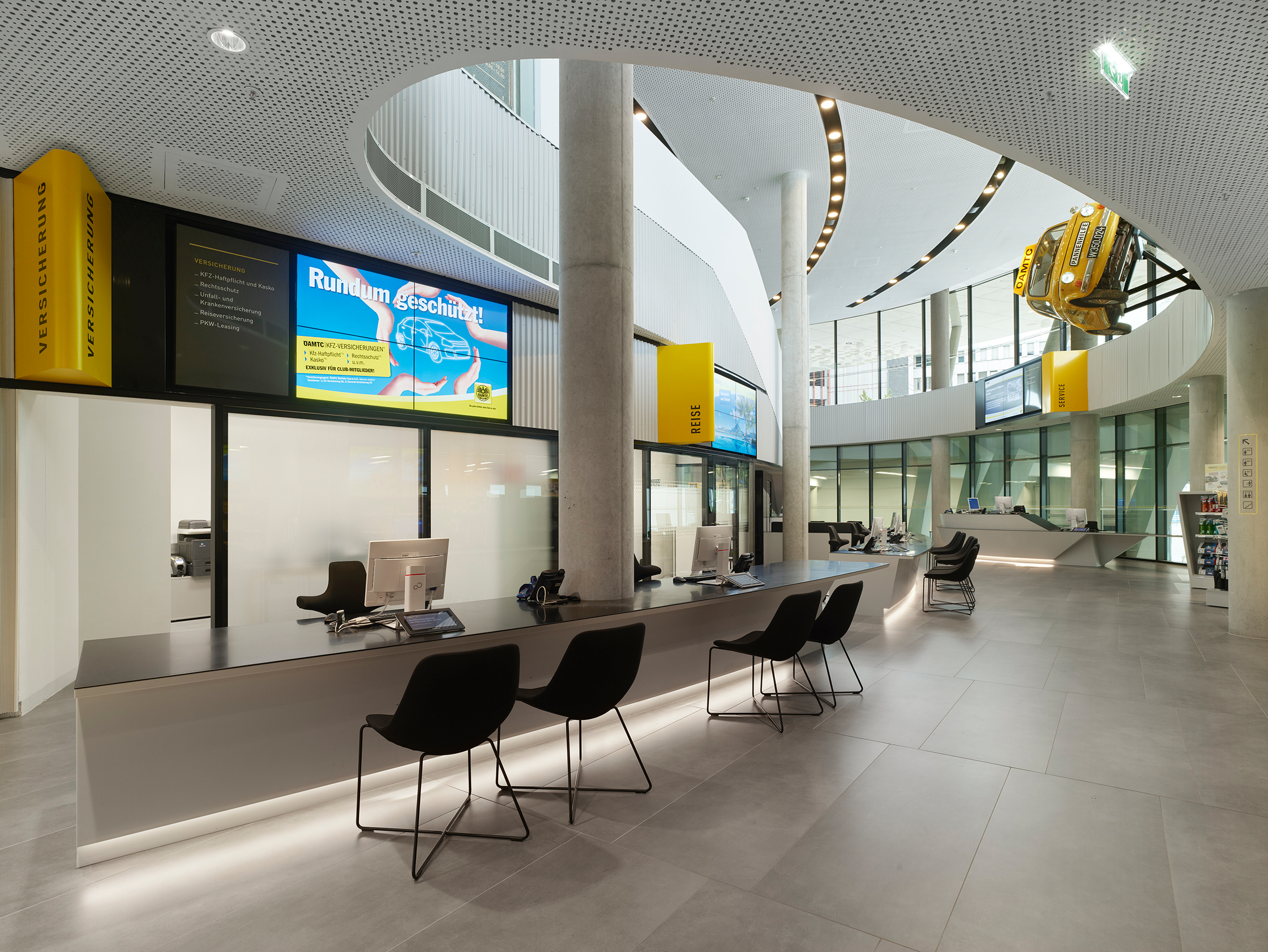 Das Ergebnis in der Innenansicht: Man sieht Automobilisten in bequemen Sesseln, die durch riesige Glasfronten die Prüfung ihres Wagens mitverfolgen, der eine Etage tiefer in der hellen, geschwungenen Werkstatt steht, die rein gar nichts von der sonst üblichen ölverschmierten Neonlicht-Garagen-Tristesse hat. Zwei Stockwerke höher flirren im Callcenter der Notrufzentrale die Finger über Tastaturen, der Blick geht über die geschwungene Glasfront hinaus ins Freie. Ein Callcenter erwartet man für gewöhnlich eher in gesichtslosen Bürokisten an der Peripherie, nicht in der Beletage einer Unternehmenszentrale. Hier jedoch sind Werkstatt und Notrufzentrale Teil der Identität, wie der ÖAMTC betont. Der Raum, der diese neue Gemeinsamkeit am deutlichsten vermittelt, ist das zentrale Atrium, dessen umlaufende weiße Brüstungen sich zueinander versetzt in die Höhe staffeln. Die Ähnlichkeit zu den sahnigen Spiralen von Frank Lloyd Wrights ikonischem Guggenheim-Museum ist nicht ganz von der Hand zu weisen.