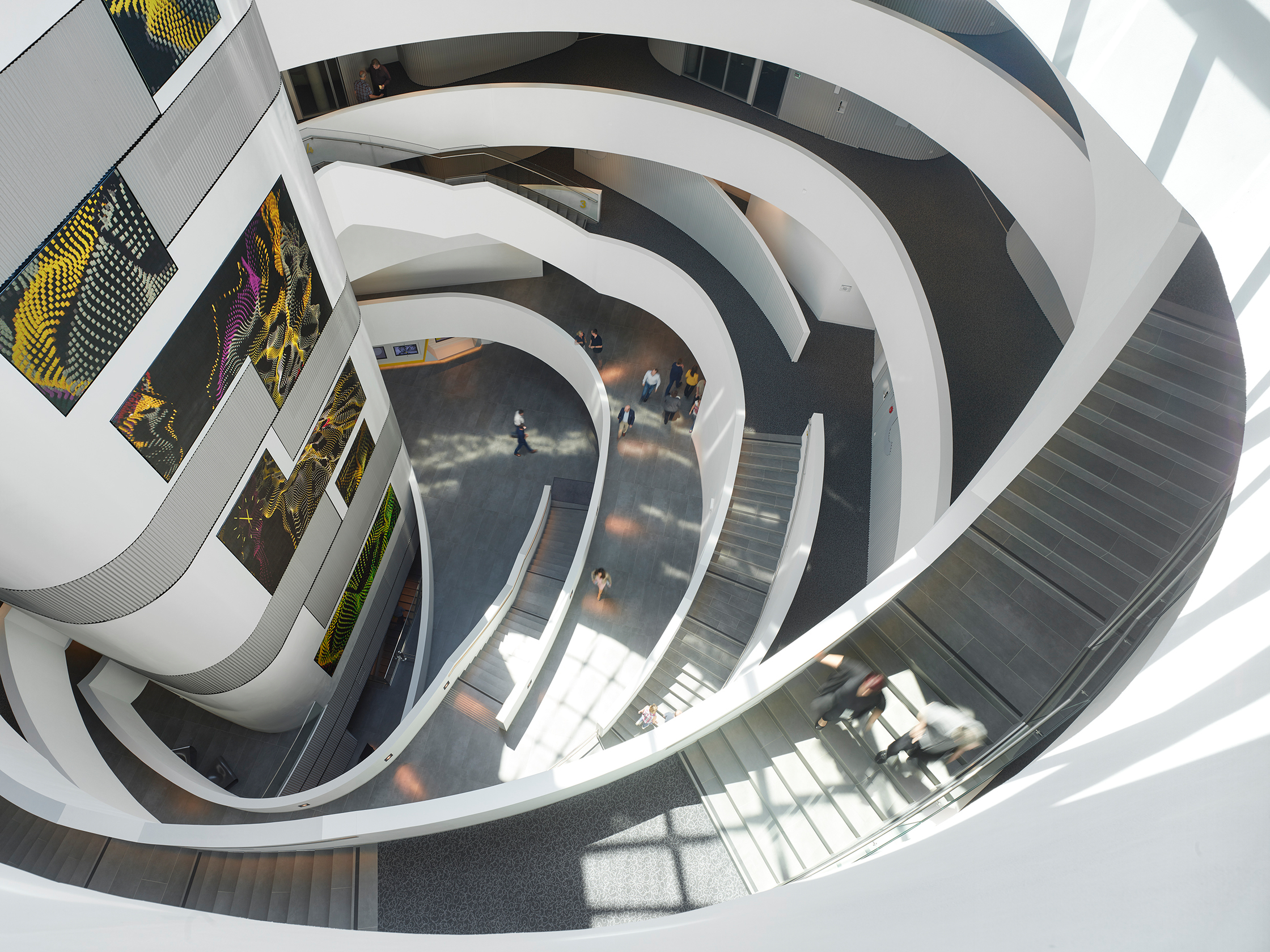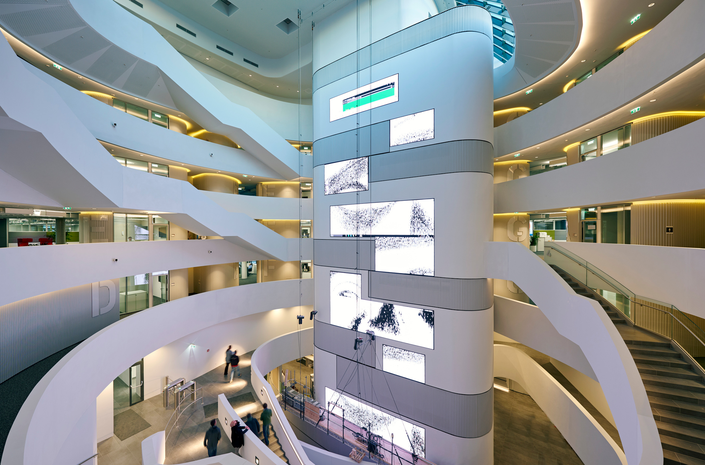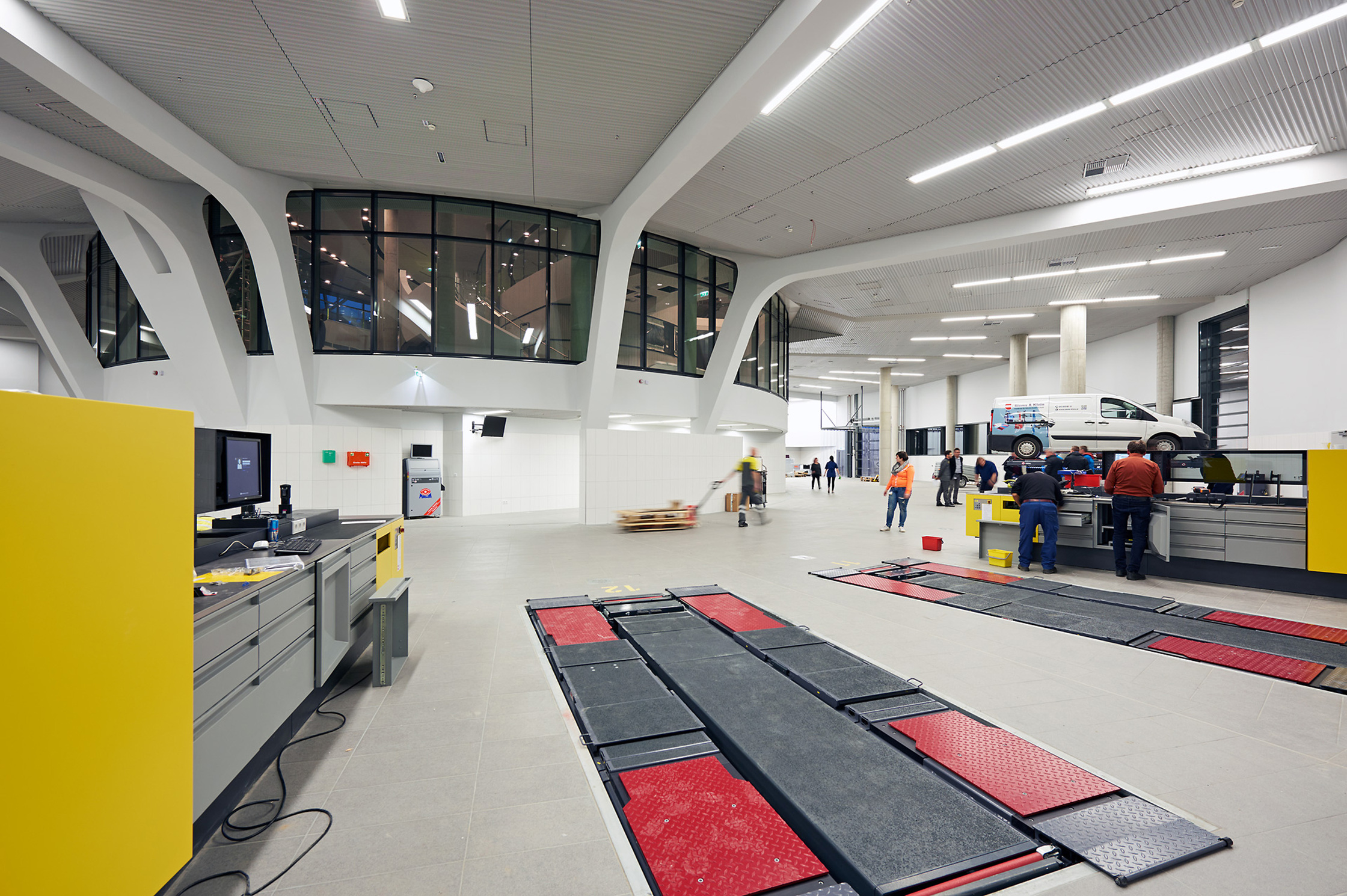 Das Ergebnis in der Innenansicht: Man sieht Automobilisten in bequemen Sesseln, die durch riesige Glasfronten die Prüfung ihres Wagens mitverfolgen, der eine Etage tiefer in der hellen, geschwungenen Werkstatt steht, die rein gar nichts von der sonst üblichen ölverschmierten Neonlicht-Garagen-Tristesse hat. Zwei Stockwerke höher flirren im Callcenter der Notrufzentrale die Finger über Tastaturen, der Blick geht über die geschwungene Glasfront hinaus ins Freie. Ein Callcenter erwartet man für gewöhnlich eher in gesichtslosen Bürokisten an der Peripherie, nicht in der Beletage einer Unternehmenszentrale. Hier jedoch sind Werkstatt und Notrufzentrale Teil der Identität, wie der ÖAMTC betont. Der Raum, der diese neue Gemeinsamkeit am deutlichsten vermittelt, ist das zentrale Atrium, dessen umlaufende weiße Brüstungen sich zueinander versetzt in die Höhe staffeln. Die Ähnlichkeit zu den sahnigen Spiralen von Frank Lloyd Wrights ikonischem Guggenheim-Museum ist nicht ganz von der Hand zu weisen.
