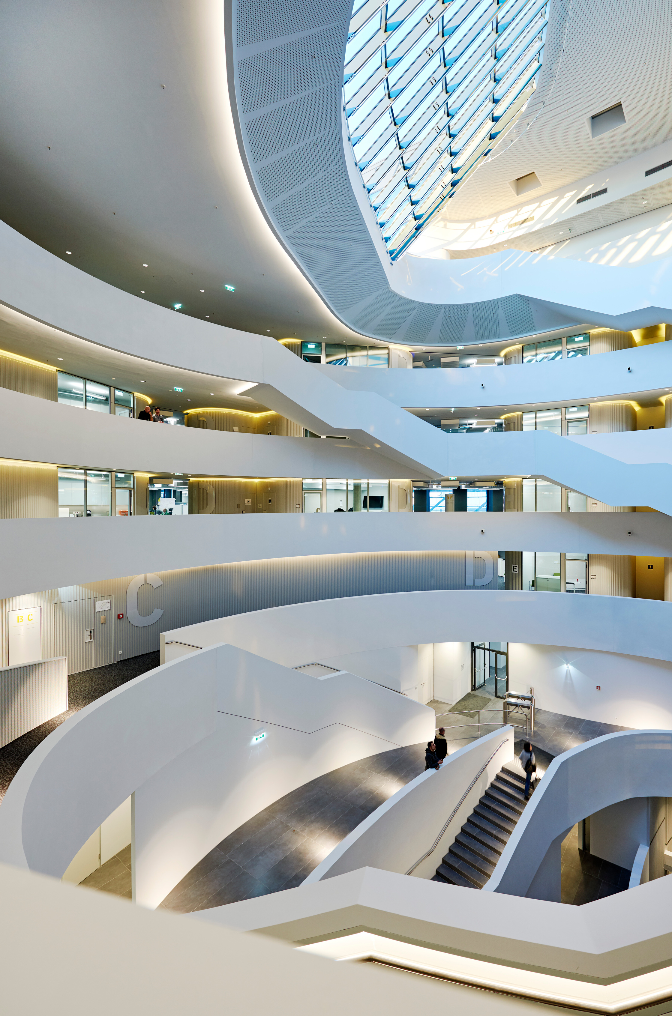 Kurvig geht es auch im Inneren zu, doch findet sich bei der Erkundung der Rundungen für jede ein handfester Grund. Auch der Grundriss mit seinen fünf Bürotrakten, die wie Speichen zwischen Atrium und Außenring stecken, entwickelte sich aus dem Wunschkatalog der Mitarbeiter, wie Architekt Christoph Pichler vom Büro Pichler & Traupmann erklärt: „Wir hören jetzt oft, das Gebäude erinnere von oben an ein Lenkrad oder einer Felge, aber daran haben wir beim Entwurf nicht gedacht.“ Vielmehr resultiere die Sternform aus dem Wunsch, abgeschlossene Bürotrakte zu vermeiden. So sind diese dank der geschwungenen Form flexibel aufteilbar, zugleich ergeben sich an den äußeren Enden ruhigere Bereiche für Mitarbeiter, die sich vor Großraumbüro-Trubel scheuen.