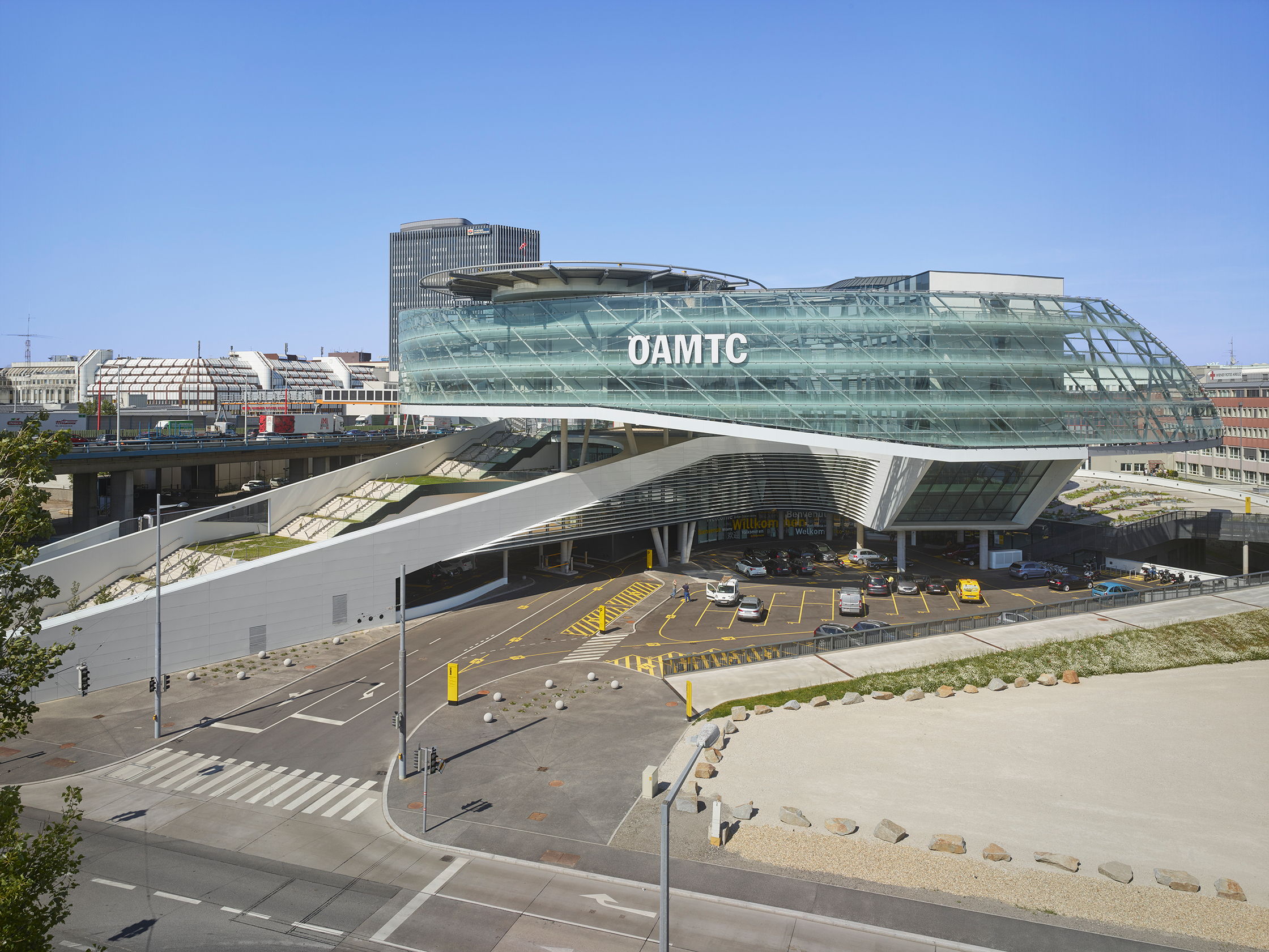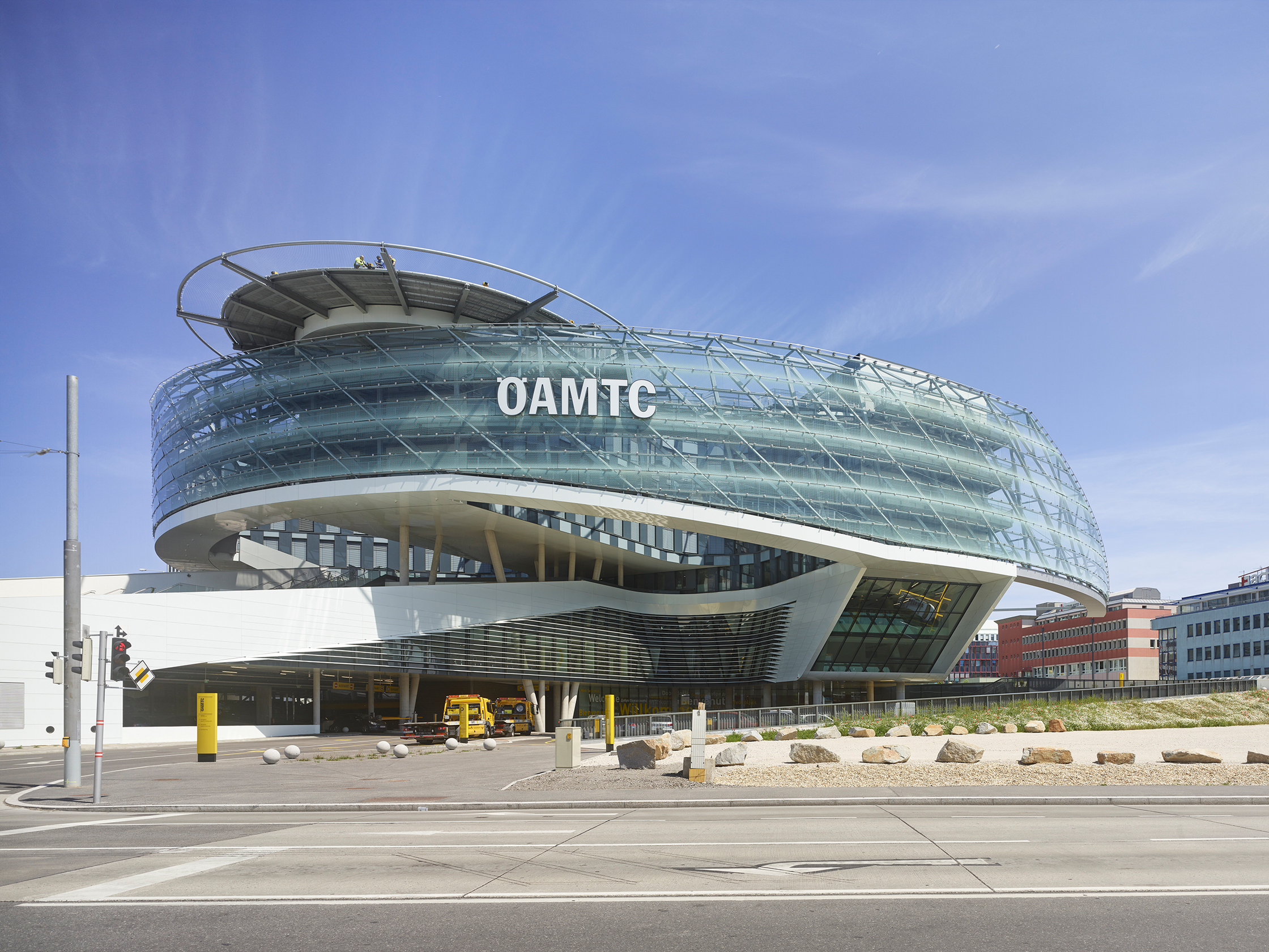 Der siegreiche Entwurf von ChristophPichler und Hannes Traupmann, die gemeinsam als PxT firmieren, hat dieses komplexe Anforderungsprofil in eine spektakuläre Struktur verwandelt, die ungebrochenen Optimismus verbreitet. Das Grundstück liegt für die Aufgabe ideal, unmittelbar an der Südosttangente, mit 170.000 Fahrzeugen pro Tag die meistbefahrene Straße Österreichs. Zugleich gibt es mit der U3-Station Erdberg einen U-Bahnanschluss, der über einen Steg kreuzungsfrei mit dem ÖAMTC verbunden ist. Der Weg führt in friedlicher Koexistenz durch den Hof eines Bürogebäudes, in dem die Wiener Linien, also die städtischen öffentlichen Verkehrsbetriebe, ihren Hauptsitz haben.
