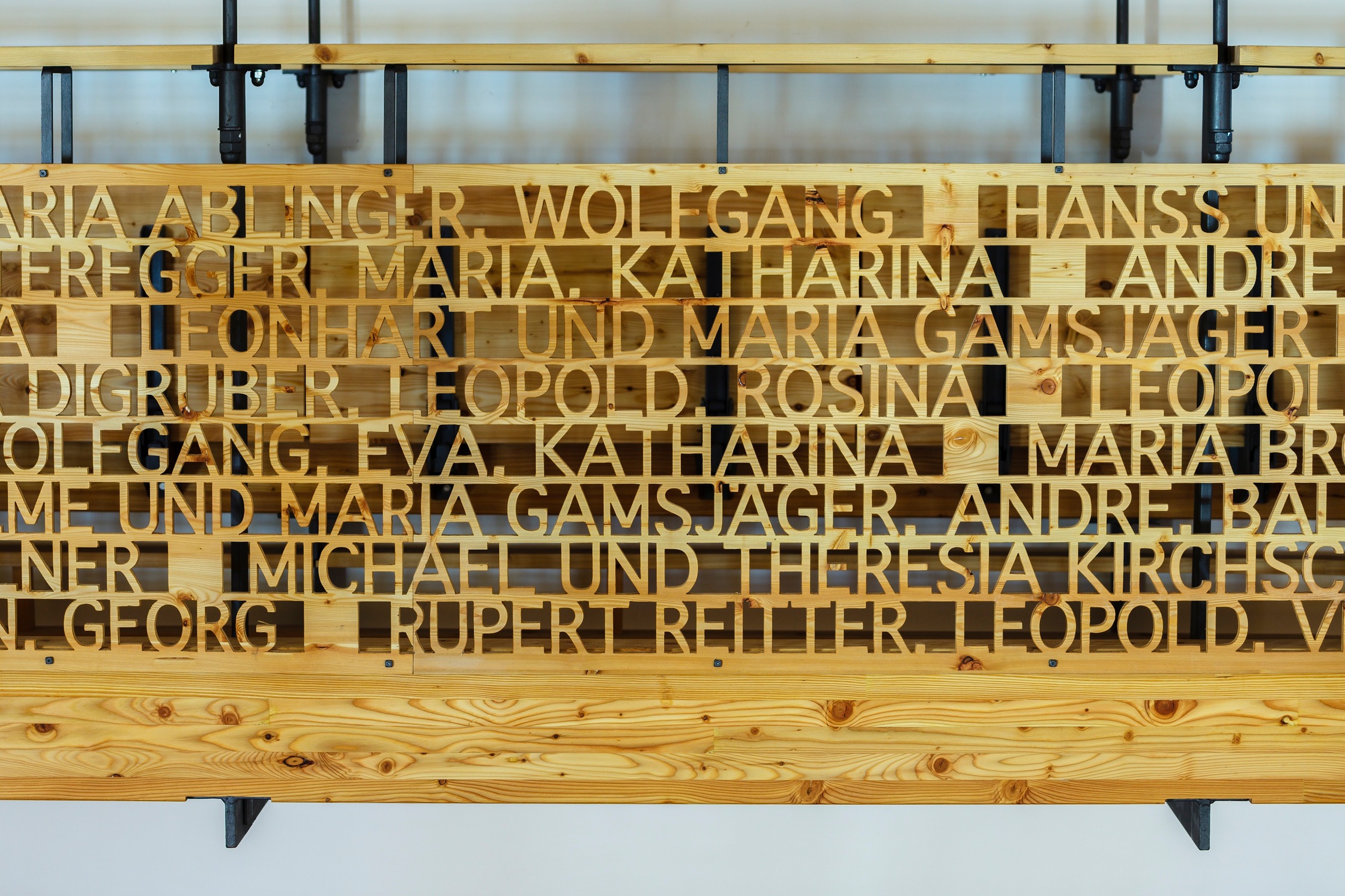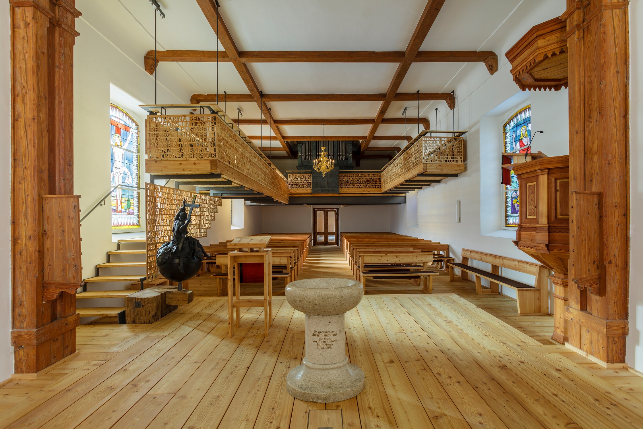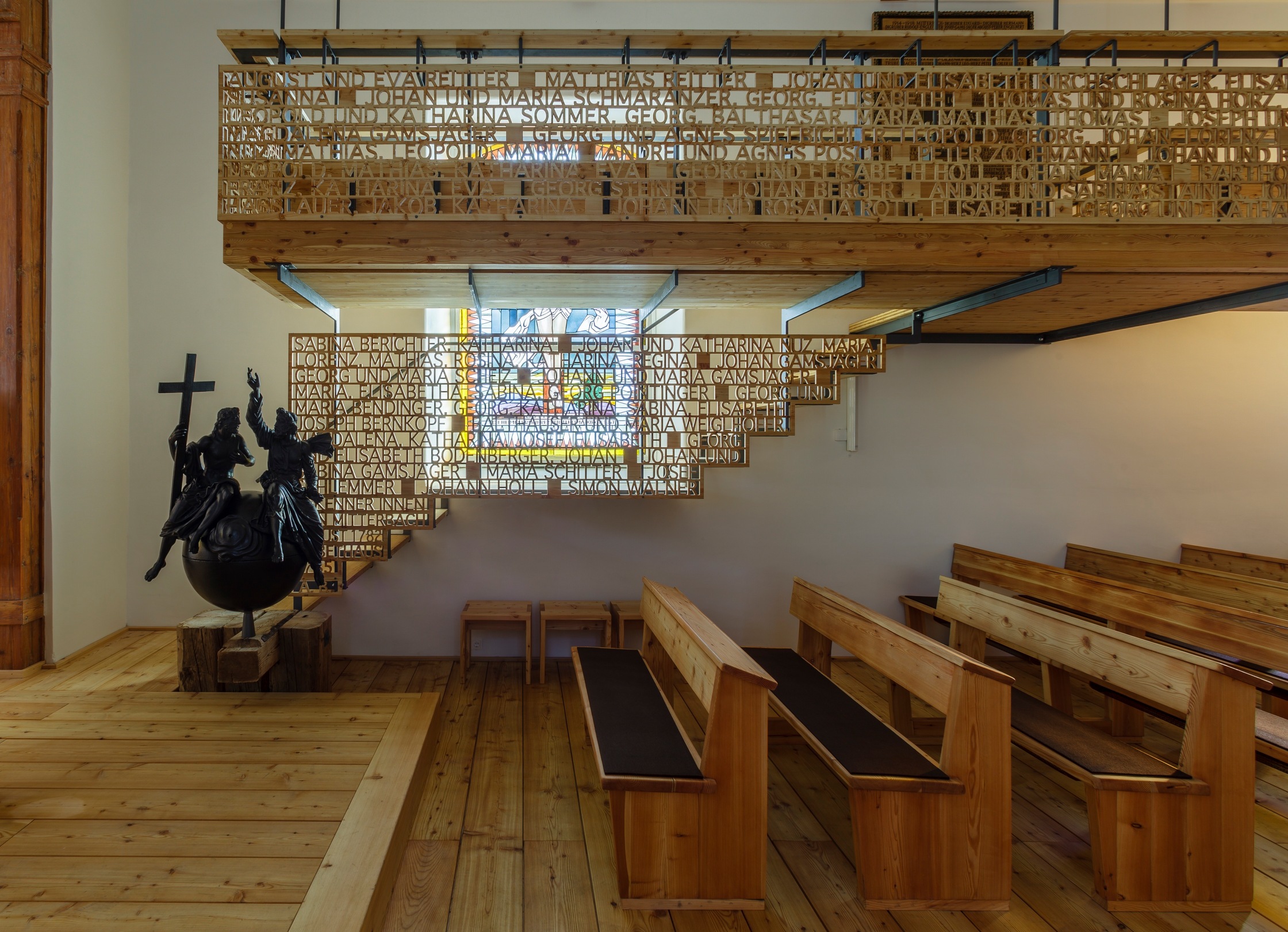 Das feine, an Laubsägearbeiten erinnernde Gitterwerk der Brüstungen – zunächst industriell aus Platten gefräst und dann Buchstabe für Buchstabe händisch nachbearbeitet – setzt sich aus den Namen der ersten evangelischen „Bekenner“ aus dem Jahr 1782 zusammen und erweist somit den Pionieren die Ehre. Das wirkt bewusstseinsbildend und identitätsstiftend, viele der Familiennamen existieren in der Gemeinde bis heute. Die so leichtfüßig wirkende Empore ist eine raffinierte Konstruktion, die auf Basis akribisch genau ausgearbeiteter Detailpläne in engem Zusammenwirken von Zimmerer, Schlosser, Tischler und Architekten entstand. Diese Art des handwerklichen Arbeitens und gemeinsamen Entwickelns sei heute wohl nur noch in Kirchen möglich, meint Ernst Beneder.
