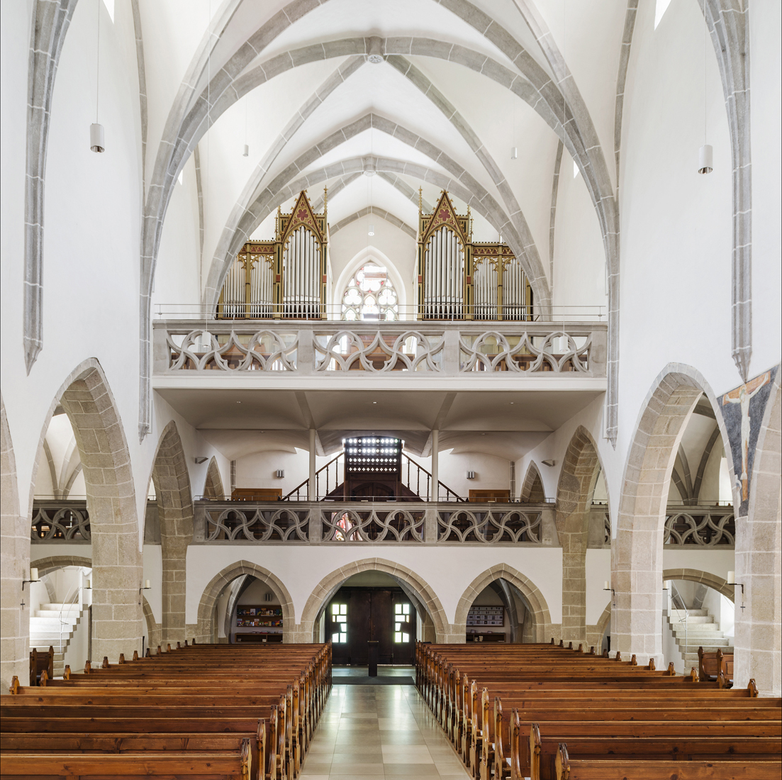 Auch das Innere der in ihrem Ursprung mittelalterlichen Kirche entspricht nun wieder den Intentionen und Anforderungen des Gottesdienstes. Nach dem teilweisen Rückbau der ersten und der konstruktiven Erneuerung der zweiten Empore, dem Öffnen der vermauerten Obergaden an der Nordseite, einer behutsamen Neuordnung von Emporenzugängen, Bankreihen, Altarraum und Taufort; kurzum: Kraft einer gründlichen, nicht zuletzt der Einbindung in das hügelige Gelände gewidmeten Überarbeitung ist die Pfarrkirche ein barrierefrei zugänglicher, in unterschiedlichen Konstellationen nutzbarer Ort geworden, in dessen mild gestimmter Ruhe weder Zeitgeist noch Mode eine Rolle spielen.