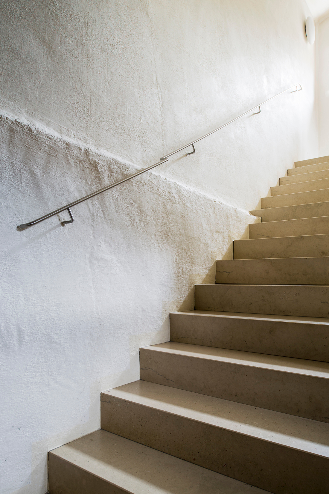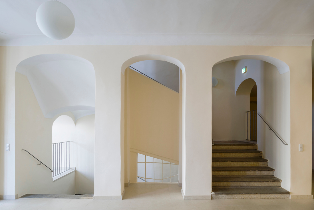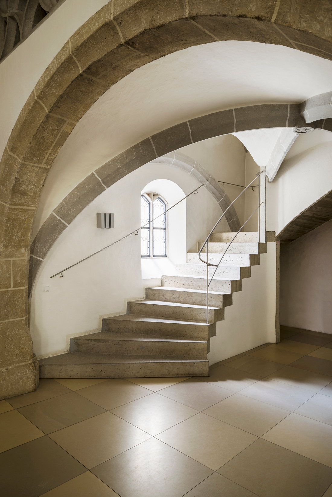 Der Wandel des Pfarrhofes vom vorwiegend landwirtschaftlich geprägten Gehöft mit angeschlossenen Wohnräumen zu einem Pfarrzentrum mit all seinen organisatorischen und seelsorgerischen Aufgaben ist bis vor Kurzem wohl ohne rechte Betrachtung der Wechselwirkungen zwischen Nutzung, Erscheinung und Bedeutung vor sich gegangen. Umso größer muss die Versuchung gewesen sein, hier Polaritäten wie alt/neu oder historisch/zukunftsweisend in eindrucksvollen Kontrast zueinander stellend gehörig auszukosten. Herbert Schrattenecker aber ist offensichtlich an der Wirksamkeit seiner Maßnahmen interessiert, nicht an ihrer – vorzugsweise verblüffenden – Wirkung. So war ihm bei der Sanierung des Pfarrhofes etwa das Schaffen von Öffnungen in den dicken Wänden des Hauptstiegenhauses ein wichtiges Anliegen. Tatsächlich haben diese den Weg durch das Gebäude mit Tageslicht erhellt und die Orientierung im Haus deutlich leichter gemacht. Ohne Kenntnis der beengten und düsteren Vergangenheit geht der Eingriff in einem über die Jahrhunderte scheinbar organisch gewachsenen Ganzen jedoch auf. Mit welchem Aufwand an Einfühlungs-, Vorstellungs- und nicht zuletzt Überzeugungsvermögen das heute so selbstverständlich scheinende Ergebnis erzielt worden ist, bleibt unsichtbar. Mit der Erinnerung an das Vorher wird das Bewusstsein für diese Leistung schnell verblassen.
