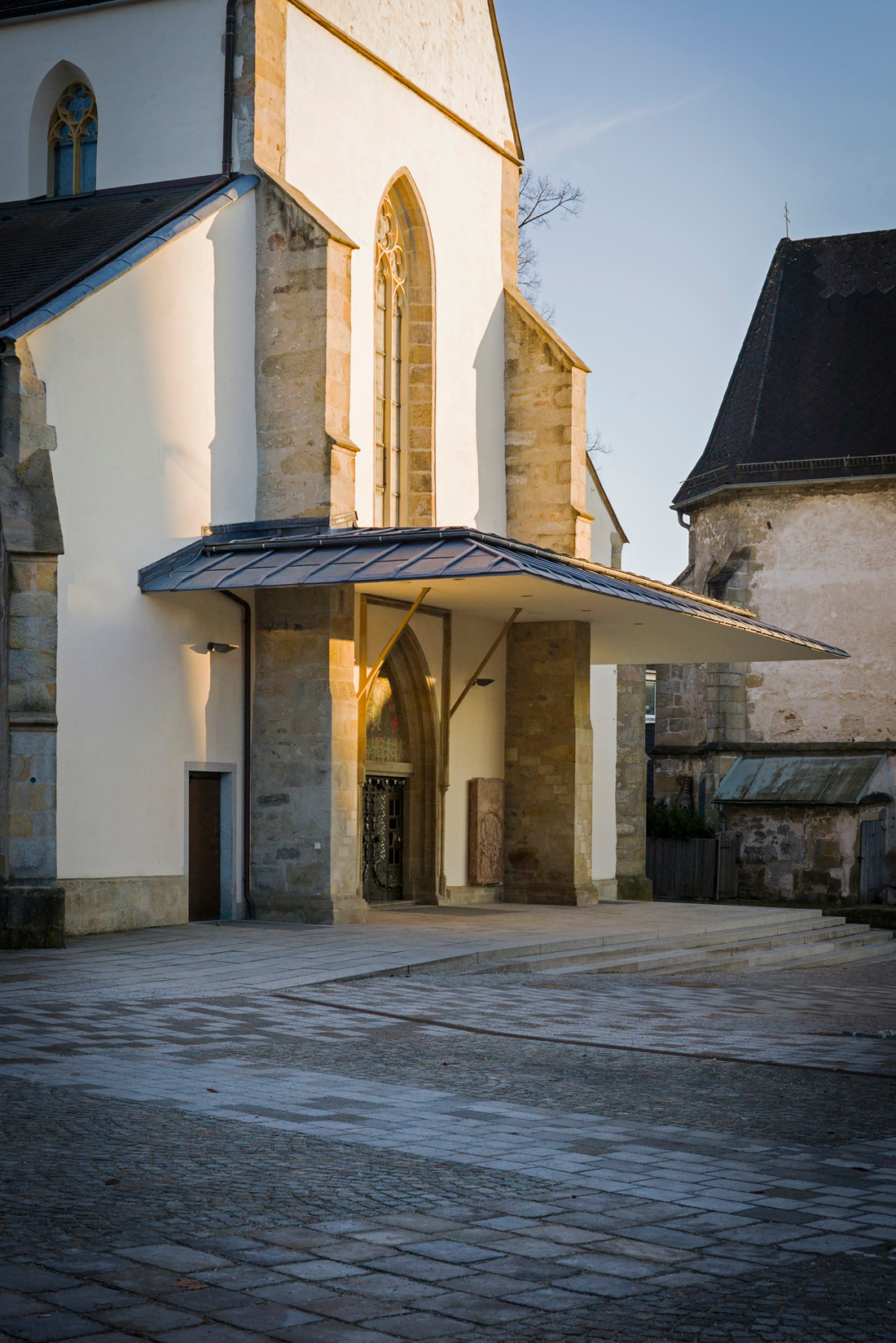 Schon mit der Renovierung der Kirche hat Herbert Schrattenecker die ersten Maßnahmen gesetzt, diese – durchaus physisch – besser zugänglich zu machen. Doch erst durch den Rückbau des über eine Vielzahl baulicher Anläufe entstandenen Pfarrhof-Konglomerates in ein gut proportioniertes und außen wie innen leicht lesbares Gebäude hat die Kirche ein Vis-à-vis bekommen, das ihrem Haupteingang an der Westseite den notwendigen (Außen-)raum lässt. Bereits im ersten Bauabschnitt konnte Herbert Schrattenecker die unbefriedigende Eingangssituation der Kirche durch den Abbruch der beiden massiven Stiegenhäuser zur Empore an der Westfassade deutlich verbessern. Diese Maßnahme ermöglichte die Anordnung zweier zusätzlicher Eingänge, die das große Tor in ihre Mitte nehmen. Ein weit ausladendes Vordach – als Tragwerk raffiniert mit der zweiten Empore verbunden und gekonnt unspektakulär in seiner Anmutung – beschirmt alle drei Zugänge und verleiht so wesentlichen Vorgängen wie dem Sich-Versammeln und dem Noch-Verweilen räumlichen Ausdruck.