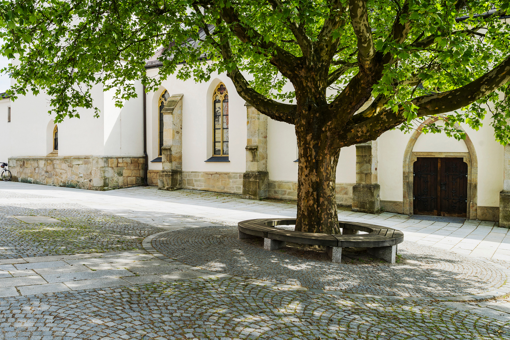 Beide Maßnahmen hat der aus Oberösterreich gebürtige und in Wien ansässige Architekt Herbert Schrattenecker geplant. Wüsste man nicht, wie radikal manche seiner Eingriffe waren, man könnte annehmen, Kirche und Pfarrhof wären immer schon so selbstverständlich Stirn an Stirn in leichtem Winkel zueinander gestanden, die südliche Kante eines annähernd dreieckigen Platzes flankierend, dessen Westseite das Rathaus säumt. Tatsächlich hat es an dieser Stelle niemals einen Platz gegeben. Historische Beschreibungen erzählen von Gräben, Stegen, Friedhofsmauern und hölzernen Verbindungsgängen; aber auch von den Schweine-, Kuh- und Pferdeställen des Pfarrhofes, die das Erscheinungsbild des Ortes prägten.