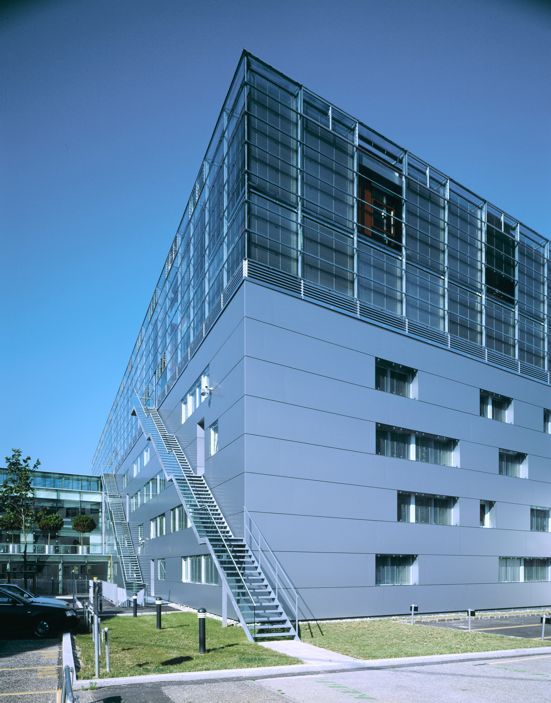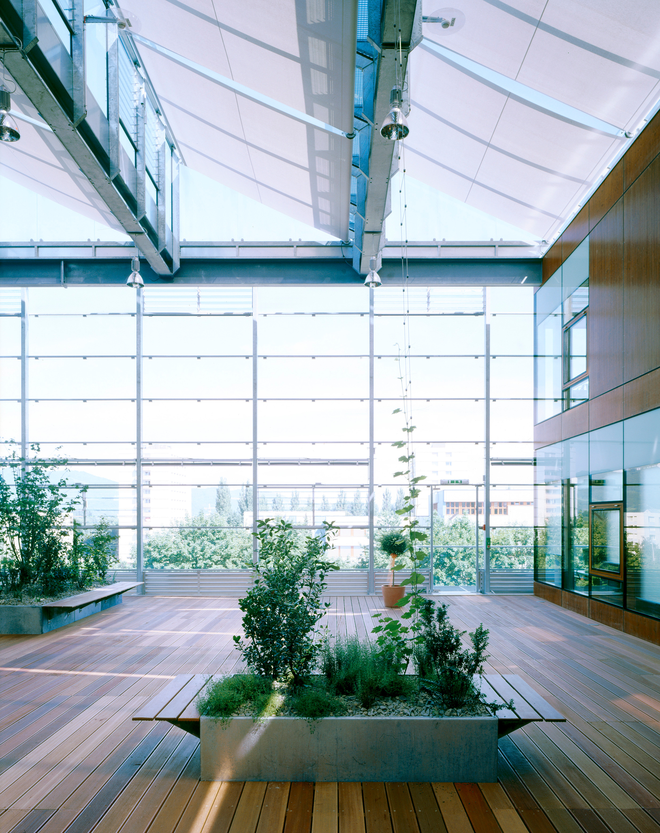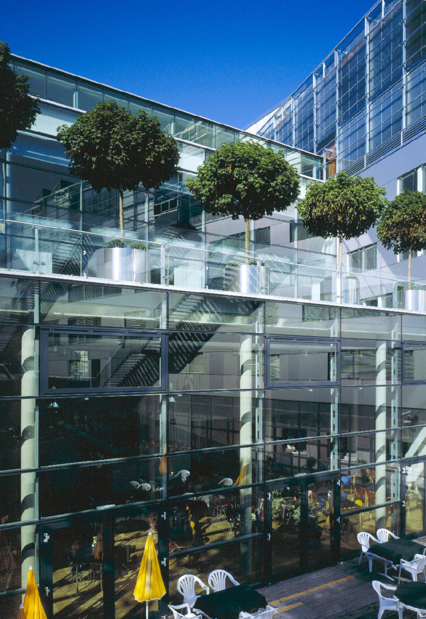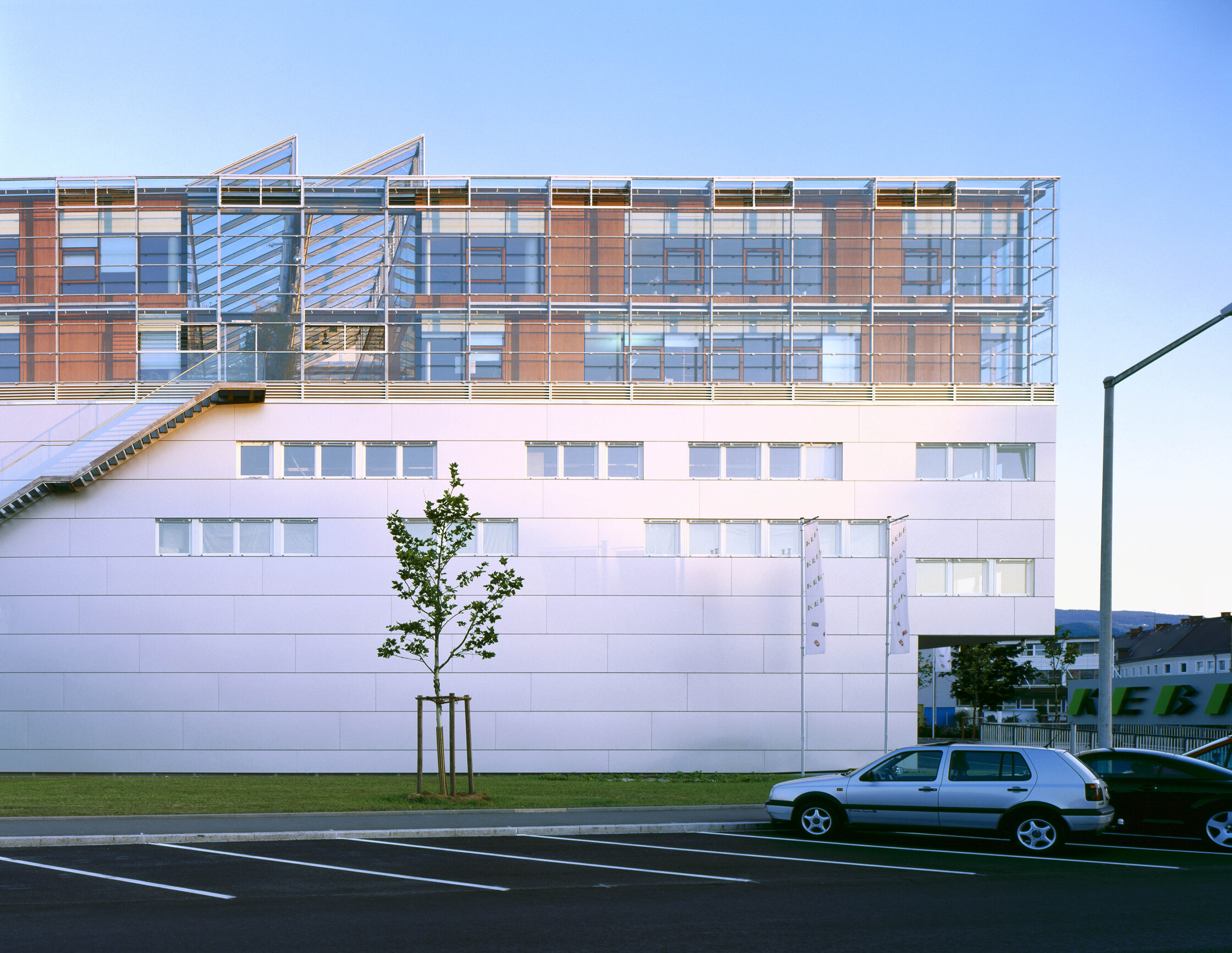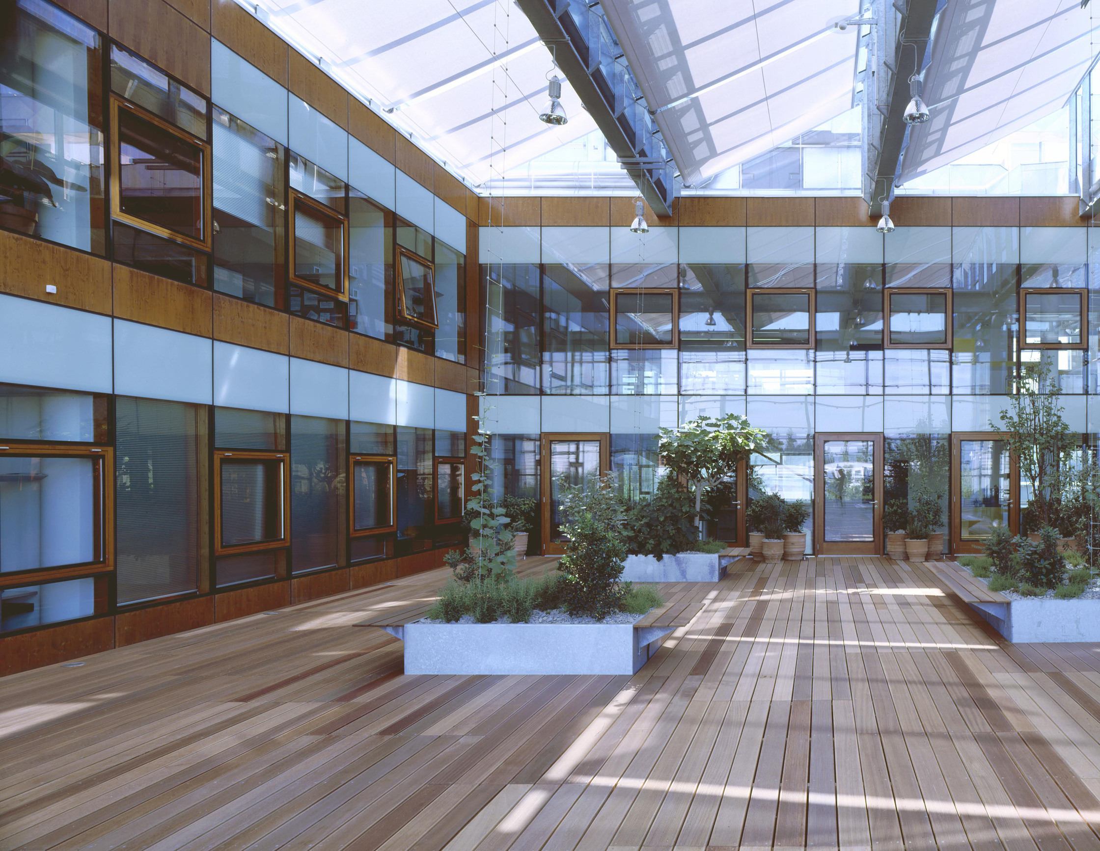 Klimahöfe schaffen optimales Mikroklima im Winter durch gepufferte Wärme und kühlere Luft im Sommer durch Kühlung des Pflanzenbewuchses und erhöhten Luftwechsel. Unkomplizierte und einfache Lüftung spart Investitionskosten und Energie sowie Raumhöhe. Nutzung der Produktionsabwärme bei Bedarf zur Vorwärmung der Bürozuluft bzw. Vorwärmung der Garage. Die Doppelfassade schafft Schallschutz. Intelligentes Spitzenmanagement für Kältekompressor, Lüftermotoren, etc. reduziert teuren Spitzenlaststrom. Wärmerückgewinnung aus dem Produktionsprozess wird auch zur Warmwasserbereitung genutzt. Drehzahlgeregelte Lüftermotoren, Wärmekaskaden, Lichtsteuerung, lichtlenkende Beschattung, intelligentes Spitzenmanagement, Wärmerückgewinnungssysteme, Abwärmenutzung aus dem Produktionsprozess auch zur Warmwasserbereitung sparen Primärenergie. Einsatz von lichtlenkender Beschattung für eine optimale Tageslichtnutzung.