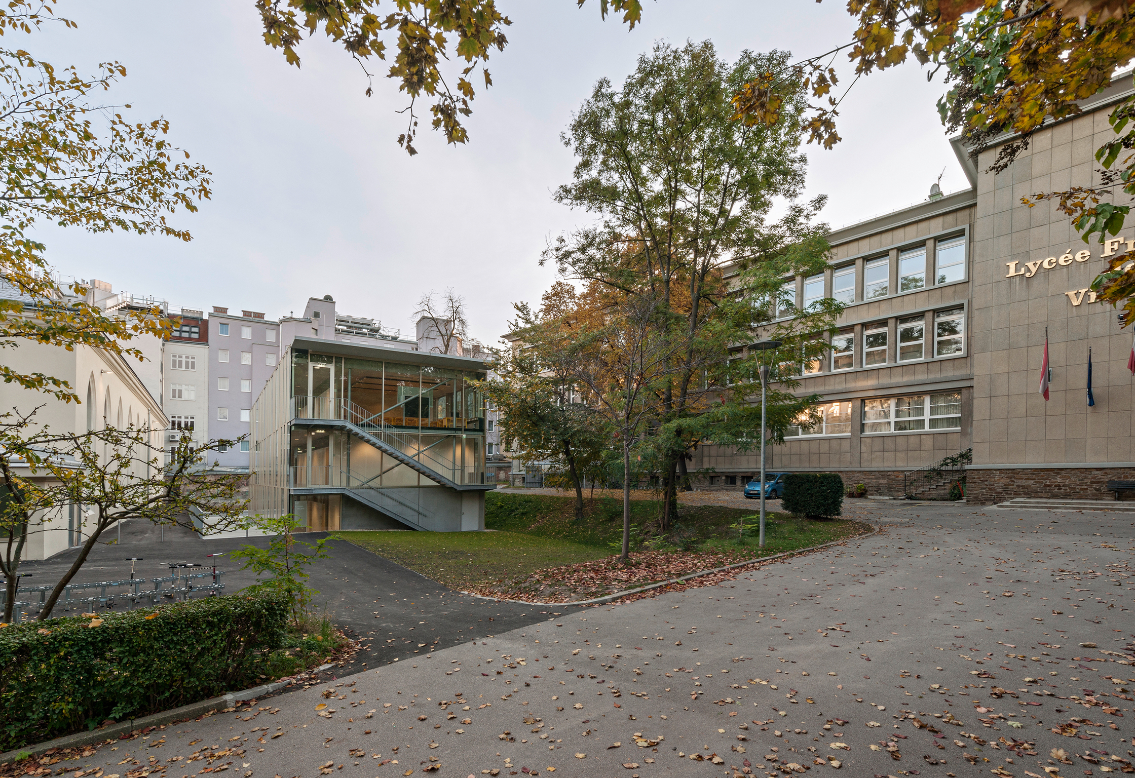 Für längst notwendige Verbesserungen auf dem Schulareal wurde 2011 ein Wettbewerb ausgelobt. Es galt, das über die Jahrzehnte stark in Mitleidenschaft gezogene Studio Molière zu revitalisieren und in einem Neubau Platz für zusätzliche Klassen zu schaffen. Siebzig Jahre nach Gründung des Lycée Français wurden im vergangenen Herbst die neuen Räumlichkeiten feierlich eröffnet. Dietmar Feichtinger, der seit 1994 sehr erfolgreich sein Büro in Paris führt, konnte den Wettbewerb, für den er neben weiteren vier französischen Architekturbüros mit Bezug zu Österreich, darunter Dominique Perrault und Nasrine Seraji, geladen wurde, für sich entscheiden.