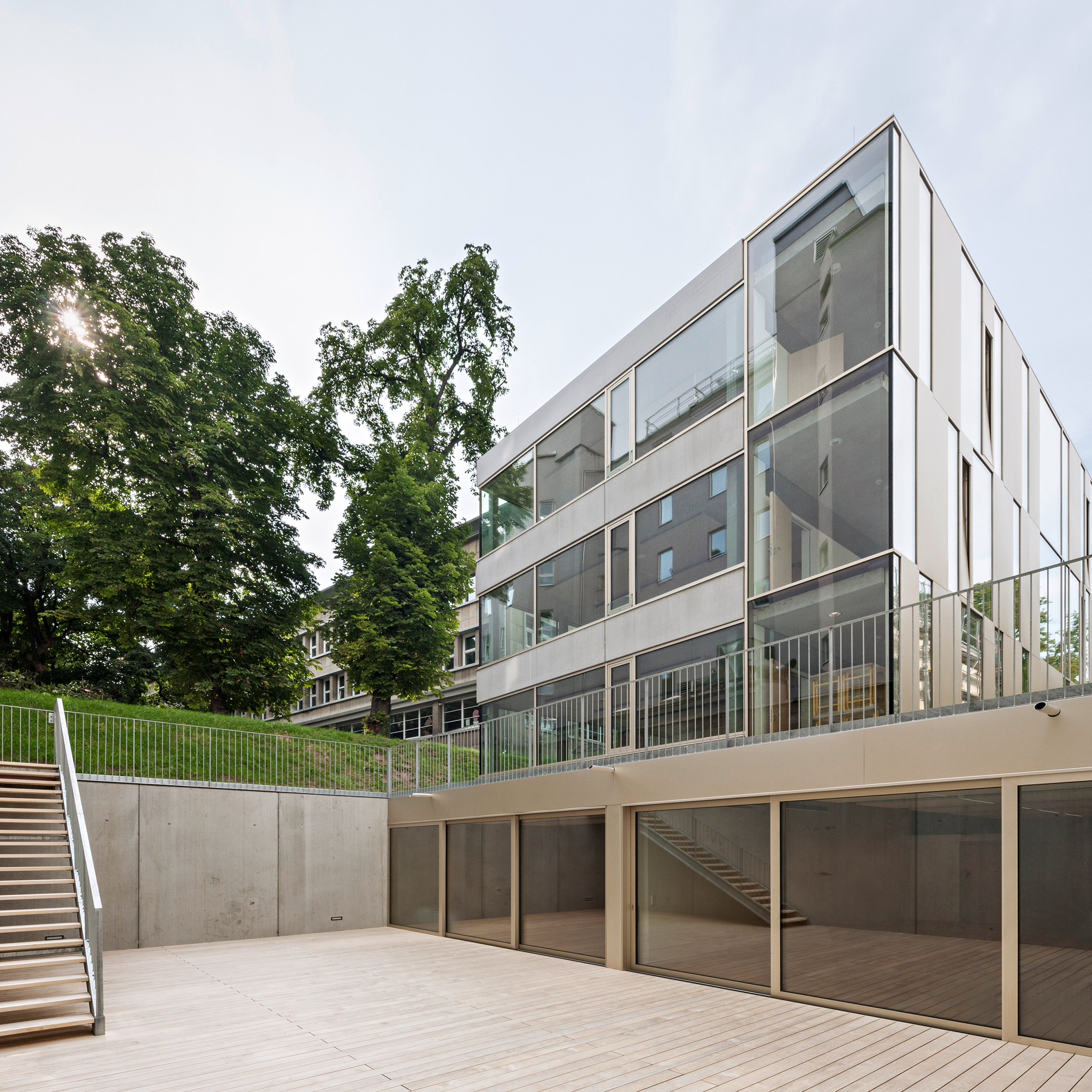 Die erforderlichen neuen Klassenräume brachten die Architekten in einem schlichten quaderförmigen, parallel zum Studio Molière situierten Baukörper auf einer zuvor als Parkplatz genutzten Fläche exakt innerhalb des für die Neubebauung gewidmeten, recht sparsam bemessenen Volumens unter, dessen Höhe sich am Gesims des Studio Molière orientiert. Dem Untergeschoß wurde südlich ein großes Atrium mit Holzboden vorgelagert, womit die hier untergebrachten Säle für Musik und Werken nicht nur viel Licht erhalten, sondern der Unterricht auch ins Freie verlagert werden kann.
