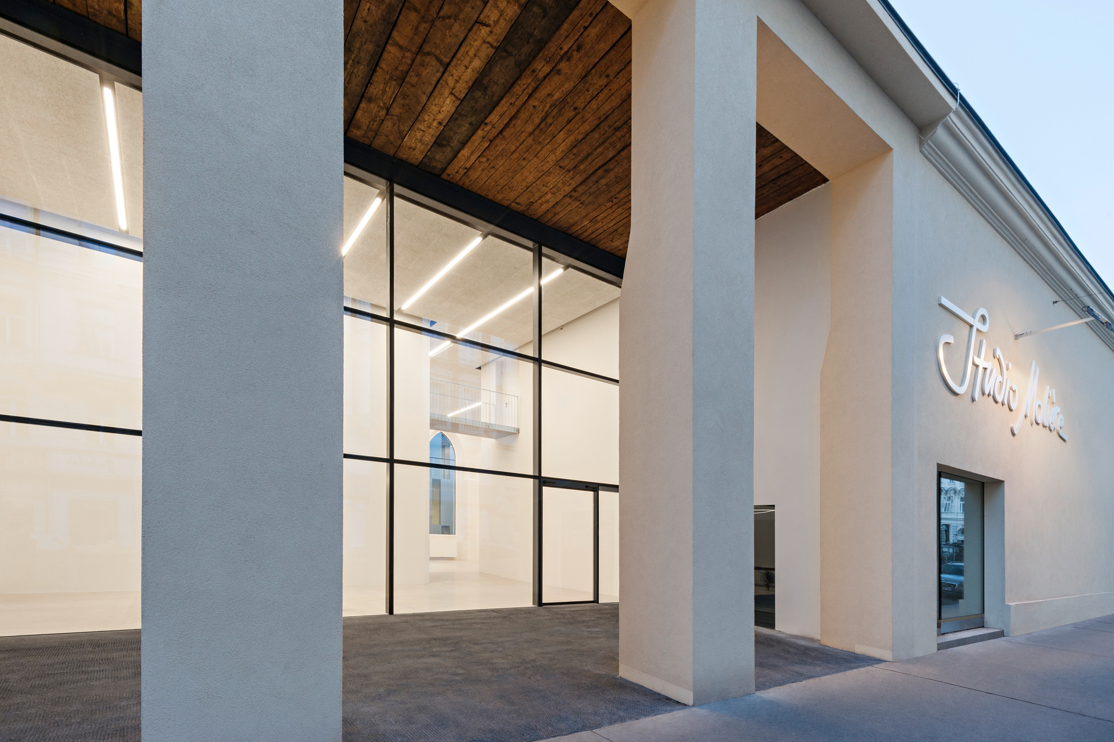 Das Studio Molière erhielt durch das Öffnen von drei Fassadenachsen bis unter das Gesims und das Entfernen zweier bestehender Zwischendecken ein großzügiges neues Entree mit offener Vorhalle als gedecktem Ankunfts- und Verweilort; die zurückgesetzte Verglasung des Kassen- und Garderobenbereichs bewirkt eine neue Transparenz, die das Gebäude zum öffentlichen Raum hin aufmacht und neue Durchblicke zum Dahinter eröffnet. Der Proportion der Straßenfassade, an der die Spitzbogenfenster aus dem 19. Jahrhundert nicht mehr erhalten waren, wurde damit ein guter Dienst erweisen. Daneben, in der Achse des ehemaligen Theatereinganges, wurde ein Gassenlokal mit Schaufenstern eingerichtet, das der Schule als Präsentationsraum dienen wird. Die straßenseitig angekündigte Großzügigkeit setzt sich im gartenseitigen Foyer, das sich über die großen, neu verglasten Spitzbogenfenster zum Schulgelände öffnet, fort. Der 240 Plätze fassende Theatersaal wurde von seiner düsteren Atmosphäre befreit. Ebenso wie das Gassenlokal ist er vom Foyer barrierefrei zugänglich, womit eine vielfältig nutz- und koppelbare Raumfolge hergestellt wurde. Über der Sanitärgruppe wurden eine vom neuen Hauptstiegenhaus aus zugängliche Maisonettewohnung für den Hausmeister und ein Gästezimmer eingebaut und mittels Schattenfugen und feiner Farbkontraste vom Bestand abgesetzt. Sowohl für kulturelle als auch schulische Veranstaltungen jedweder Art steht somit an diesem traditionsreichen Ort mit wechselhafter Geschichte nach Jahren des Stillstands wieder eine zeitgemäße Infrastruktur bereit.