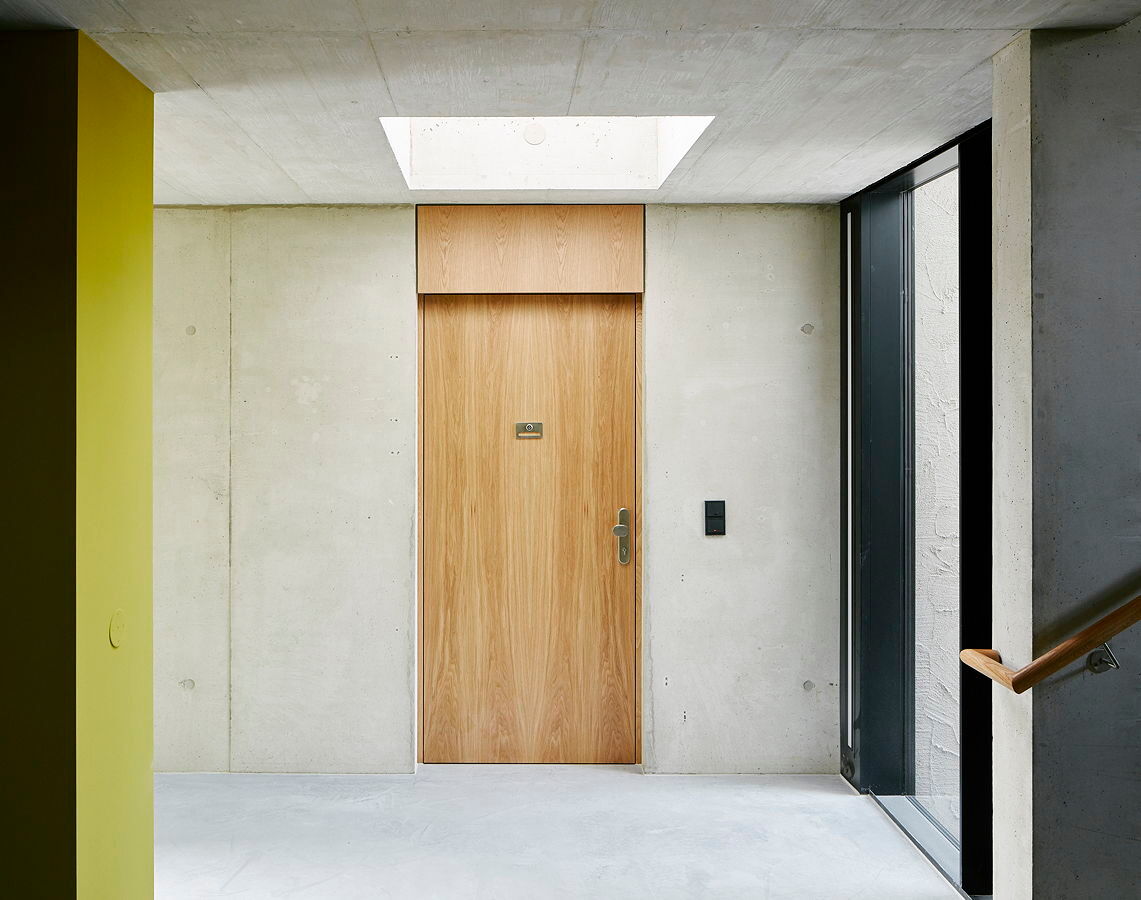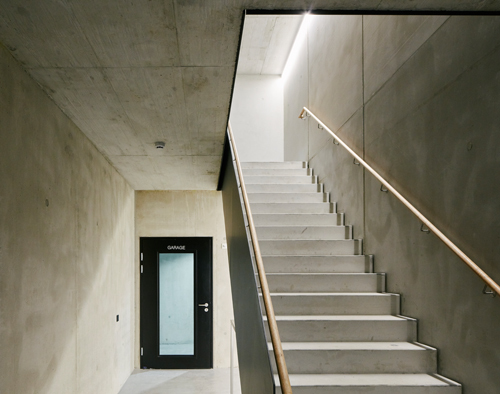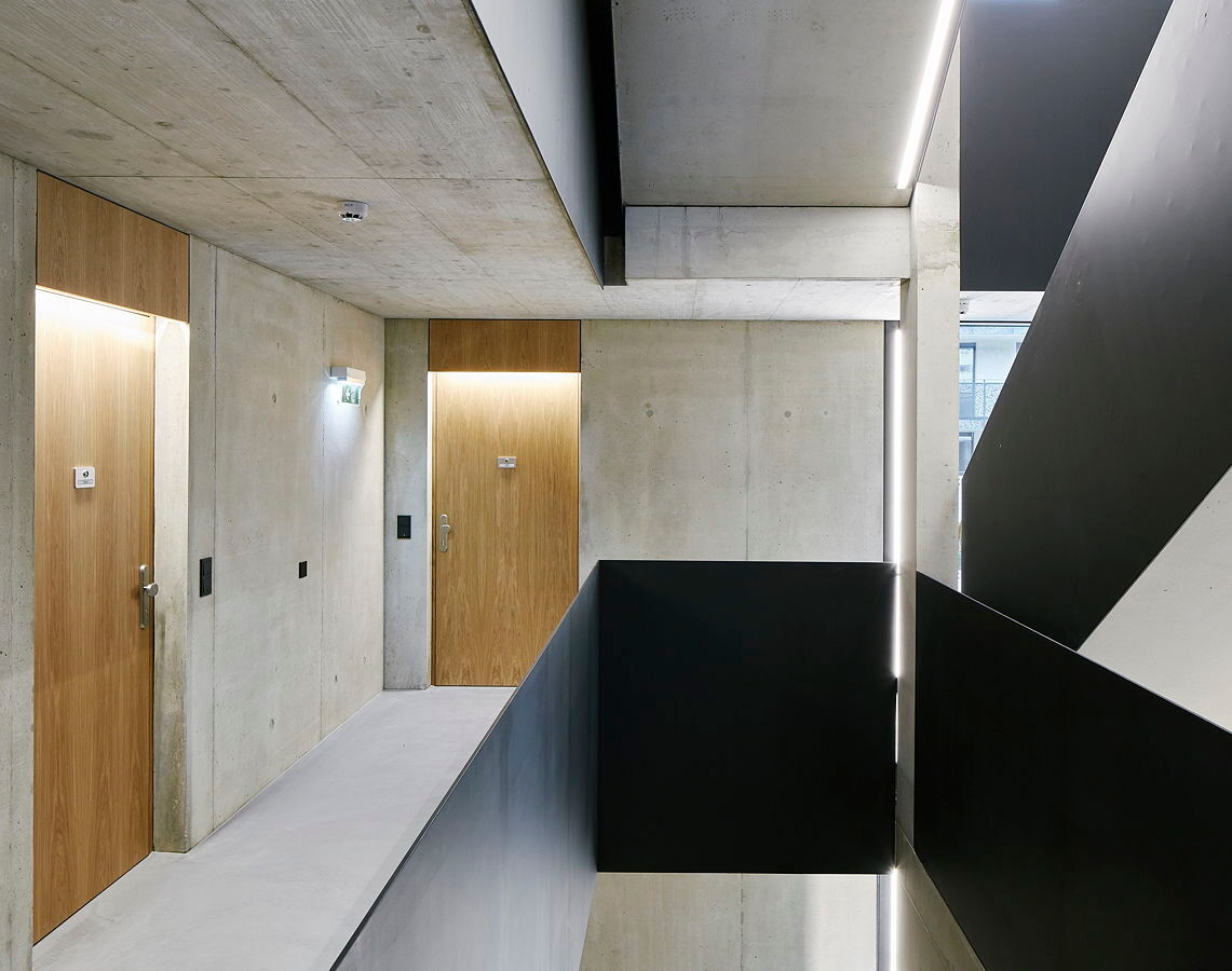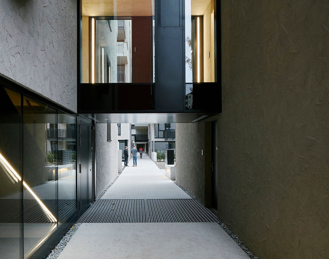 Materialität und Farbigkeit sind reduziert: Beton, Putz, Metall, Holz. Sparsame Farbakzente in Signalfarben à la Le Corbusier finden sich nur in den Stiegenhäusern, wo wie in den Gängen Sichtbeton dominiert. Brüstungen aus schwarzem Stahlblech, Handläufe aus Holz und raumhohe Eichentüren, in deren Holzverblendung die Gangbeleuchtung integriert ist, sorgen für ein edel anmutendes Ambiente. Von den Erschließungszonen aus, wo raumhohe Verglasungen von schwarzen Lüftungsflügeln begleitet werden, offenbart sich die Raffinesse des detailreichen Siedlungsgewebes noch eindrücklicher als auf dem Gartenniveau. Durchblicke und Fugen geben Ausschnitte der Siedlung und schöne Aussichten auf die Umgebung frei. Es ist ein äußerst wohlgestalteter Wohnbau, der sich nicht arrogant gegenüber den älteren Nachbarn aufspielt, sondern mit ihnen in einen Dialog tritt und damit auch sie stärkt.
