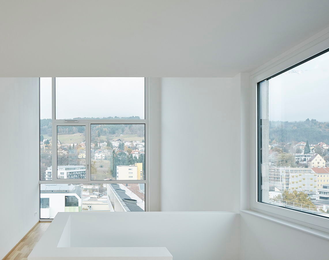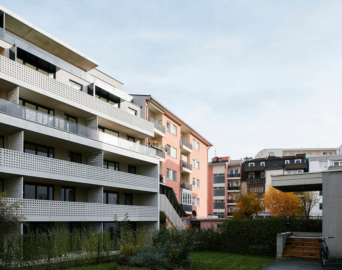 Und es gelang der Beweis, dass trotz der vielbeklagten zu erfüllenden Vorschriften und Normen eine Wohnanlage ein Stück Baukunst sein kann. Dazu braucht es anspruchsvolle Bauherren, die das überhaupt wollen. Der Bauträger Weinberg, der in diesem Fall den überwiegenden Part verantwortet, sei so ein Bauherr, meint Architekt Wiesflecker. Für den Bauteil an der Ampfererstraße, der eine Kinderkrippe und Wohnungen beherbergt, war ein anderer Auftraggeber zuständig, der meinte, an Details einsparen zu können. Zusammengestutzte Manschetten bei den Rundfenstern und um ein paar Zentimeter verkürzte Geländer: Ob das den Gewinn um so viel aufgefettet hat, wie es ästhetisch schmerzlich ist?
