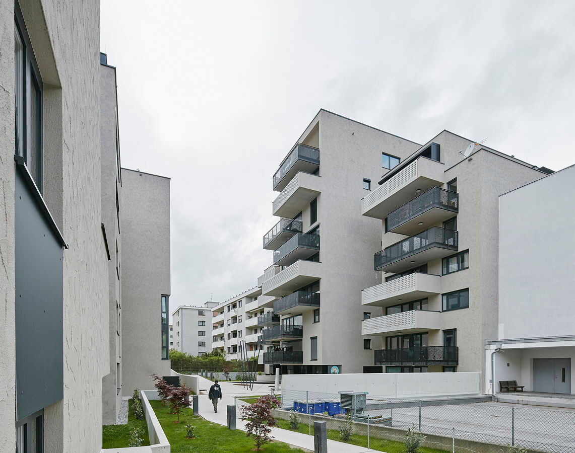 Die Herausforderung für die zehn geladenen Wettbewerbsteilnehmer bestand darin, die neue Anlage in die bestehende Baustruktur aus Fragmenten älterer Blockrandbebauungen und zeilenförmigen, durchgrünten Bebauungen, denen städtebauliche Überlegungen und Bebauungspläne aus den 1960er- und 1970er-Jahren zugrunde liegen, einzufügen und trotz hoher Dichte hohe Wohnqualität zu schaffen. Johannes Wiesflecker in Arbeitsgemeinschaft mit seinem früheren Mitarbeiter Michael Kritzinger konnte die Jury mit einer schlüssigen Weiterentwicklung der bestehenden Zeilenbebauung und einer Verdichtung zur Mitte hin überzeugen. Die Entwicklung in die Vertikale spielt Platzräume frei, unterschiedliche Höhen und Haustypen erzeugen Vielfalt: So kann man die städtebauliche Strategie der Architekten knapp zusammenfassen.