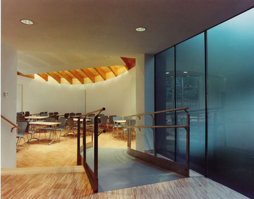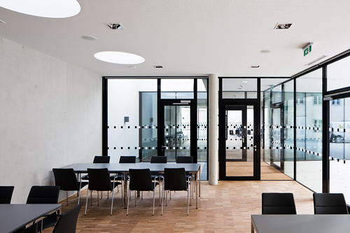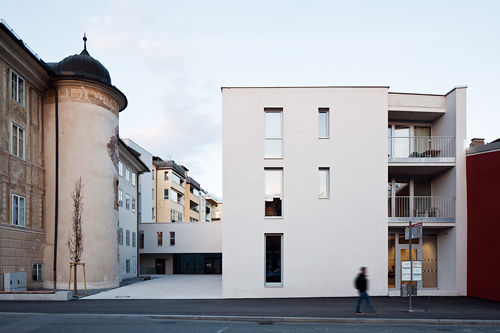 Die öffentlichen und halböffentlichen Nutzungen sind im Erdgeschoss untergebracht. Im Kopfbau zur Liebeneggstraße befindet sich ein Sozialzentrum der Innsbrucker Dienste, an der Leopoldstraße ein Veranstaltungsraum und an diesen angeschlossen das Büro des Stadtteilzentrum Wilten mit einem Seminarraum sowie der gemeinsame Aufenthaltsraum für das betreute Wohnen. Raumhohe Glaselemente Richtung Platz bringen Licht in dieses Raumkontinuum, an der Rückseite, wo der Bau zu großen Teilen direkt an bestehende Objekte angedockt ist, sorgen kleine Innenhöfe für eine zusätzliche Belichtung. In den Obergeschossen der Kopfbauten und des Verbindungstrakts befinden sich insgesamt 17 behindertengerecht ausgestattete 2-Zimmer-Wohnungen mit kleinen Terrassen bzw. Loggien. (Text: Claudia Wedekind)