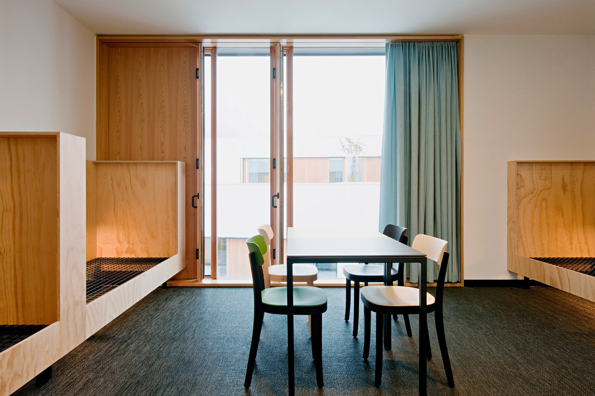 Die Aufenthaltsräume – immer zwei, durch eine Glaswand getrennt – und selbst die Schlafräume der neun Wohngruppen, die sich jeweils um einen Hof gruppieren, sind durch raumhohe Verglasung taghell und teilweise besonnt. Auch das ist keine Selbstverständlichkeit. Von Würde ist die Rede, von der Schaffung eines angenehm wohnlichen, würdevollen Ambientes als oberste Prämisse eines architektonischen Konzepts, das dazu beitragen soll, den Aufenthalt der Menschen, die auf ihre „Außerlandesbringung“ warten, erträglich zu machen. Abgehängte Decken, wie sie in Büros üblich sind, wurden daher vermieden. In der Teeküche und im gemeinsamen Wohnraum ist helles Sperrholz als Wandvertäfelung eingesetzt. Jede Wohneinheit hat als Rückzugsorte ein Raucherzimmer und Sitznischen. Teppichböden in allen Räumen und die Farbigkeit von Polstermöbeln und Bestuhlung sollen für Wohnatmosphäre sorgen.