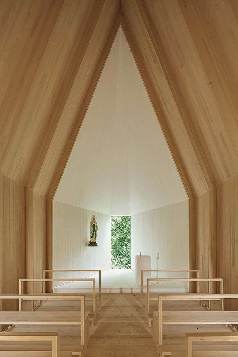 Der dem äußeren Gebäudevolumen entsprechende Innenraum ist zweigeteilt. Im vorderen Bereich mit den Tannenholz-Bänken bestehen die unmittelbar in die geneigten Dachflächen übergehenden Wände und die zwölf grazilen Spanten – ebenso wie der Boden – aus unbehandelter Tanne. Anders als diese auf traditionelle bäuerliche Stuben bezugnehmende Materialität erscheint die dreiecksförmige, um eine Stufe erhöhte Apsis als eine Art Schmuckkästchen in weiß getünchter Tannenholztäfelung. Der Raum wirkt sehr natürlich, was nicht nur an seinen Holzoberflächen, sondern v. a. auch an seiner archaischen Form liegt. So verengt sich die Apsis trichterförmig nach Osten hin bis zu einer mittig angeordneten, rahmenlos verglasten Öffnung, die den Blick auf eine nahe Baumgruppe, sowie auf die Felder, Wälder und Wiesen des Bregenzerwalds freigibt. Die stille Symmetrie des Raums wird von der asymmetrischen Platzierung des Altarblocks, der Kerzenständer und der aus der alten Kapelle stammenden Marienfigur – deren blaue Schärpe den einzigen Farbakzent im Innenraum bildet – überlagert: Im Raum ergibt sich eine unaufgeregte Spannung, die der durchweg feinsinnig detaillierten Komposition mit denkbar wenigen Mitteln ein hohes Maß sakraler Würde verleiht. Über einem Betonsockel, bekleidet mit Bregenzerwälder Sandstein, ist die Kapelle konstruktiv als Holz-Faltwerk aus 6 cm dicken Fichten-Kreuzlagenholzplatten (mit innerer Tannenholz-Deckschicht) konzipiert, das durch die polygonale Dachform ausgesteift wird. Die Spanten minimieren hierbei lediglich die Durchbiegung der Massivholzwände. Eine offene Fuge zwischen Sockel und Holzaufbau ermöglicht eine natürliche Luftzirkulation sowohl im unbeheizten Innenraum als auch im Bereich der gesamten Holzkonstruktion und verhindert so in der kalten Jahreszeit die Kondensatbildung.