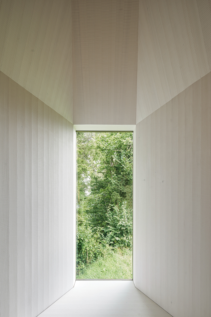 Ein niedriger, offener Vorraum mit einer festlichen Tür aus gehämmerten Messingstreifen empfängt die Besucher und bremst ihren Bewegungsfluss sanft ab – über dem Vorraum befindet sich, in einem geschlossenen Hohlraum, die Glocke. Sollte die Tür für Menschen, die hier innehalten möchten, je verschlossen sein, erlauben zwei große, seitliche Festverglasungen zumindest den Blick ins schlichte Innere der Kapelle.